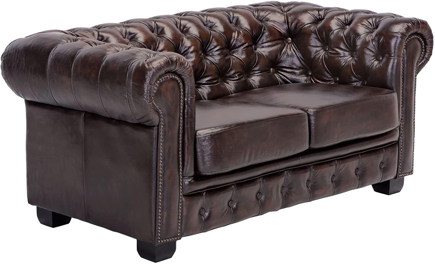 Das Chesterfield 2-Sitzer Sofa aus Echtleder in Antik Braun vereint zeitloses Design mit höchstem Komfort. Mit seiner klassischen Chesterfield-Optik und der handverarbeiteten Rindsleder-Oberfläche ist es ein elegantes Möbelstück, das jedem Raum Stil verleiht. Die integrierte Federkernpolsterung sorgt für ein angenehmes Sitzerlebnis, während der stabile Hartholzrahmen und die sichtbaren Echtholzfüße in Kolonialbraun für Langlebigkeit und Robustheit stehen. **Highlights** - Zeitloses und elegantes Chesterfield Design - Handverarbeitetes echtes Rindsleder - Integrierte Federkernpolsterung für angenehmen Sitzkomfort - Stabiler und robuster Hartholzrahmen - Sichtbare Echtholzfüße in Kolonialbraun **Produkteigenschaften** - Sitzkomfort: fester angenehmer Sitz, die Sitzkissen sind fest vernäht - Sitzfläche: Federkern, atmungsaktiver Polyätherschaum in 3 Schichten (40 kg/m³, 30 kg/m³ und 22 kg/m³) - Rückenteil: elastische Polstergurte, atmungsaktiver Polyätherschaum
