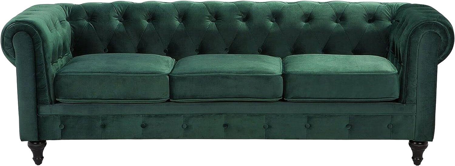 Klassisches 3-Sitzer Sofa im glamourösen Chesterfield-Stil in edlem Smaragdgrün. Der hochwertige Samtstoff und die charakteristische Knopfverzierung verleihen diesem Sofa eine zeitlose Eleganz. Mit abgerundeten Armlehnen und Wellenfederung bietet es höchsten Komfort und lädt zum Entspannen ein. Die breite und tiefe Form sorgt für ein angenehmes Sitzgefühl. **Highlights** - Hochwertiger Samtstoff für edlen Look - Charakteristische Knopfverzierung für stilvolle Akzente - Breite und tiefe Form für maximalen Komfort - Rundumbezug ermöglicht freie Platzierung im Raum - Abnehmbare Bezüge für einfache Pflege **Produkteigenschaften** - Typ: 3-Sitzer Sofa - Stil: Glamourös - Farbe: Grün - Farbton: Smaragdgrün - Material: Samtstoff - Zusätzliches Material: Gummibaumholz - Füllmaterial: Schaumstoff - Zusammenstellung: 100 % Polyester - Armlehnen: Abgerundet - Rückseite mit Polsterbezug: Ja - Muster: Kein Muster - Sitzkonstruktion: Wellenfederung - Schaumstoffdichte: 24 kg/m³ - Anzahl Sitzplätze: 3 Personen - Abmessungen: - Höhe Armlehnen: 70 cm - Tiefe: 75 cm - Dicke der Polsterauflagen: 15 cm - Sitzhöhe: 45 cm - Breite: 202 cm - Höhe: 70 cm - Sitzfläche: 158 x 56 cm - Gewicht: 49 kg - Max. Belastung p.P: 150 kg **Lieferumfang** - 1 x Sofa - Beine / Füße nicht montiert