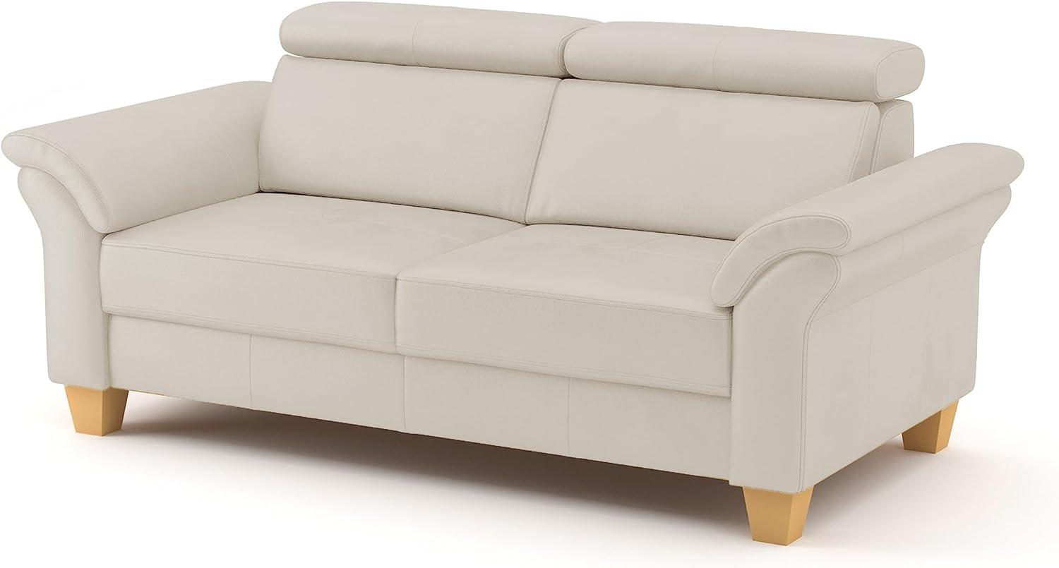 Das CAVADORE 3-Sitzer-Sofa Ammerland in Echtleder überzeugt mit Federkern, verstellbaren Kopfteilen und modernem Landhausdesign. Die Polsterung aus Federkern und atmungsaktiven Polsterschäumen sorgt für hohen Sitzkomfort. Das hochwertige Leder "Punch" in Reinweiß und die stabilen Holzfüße aus eichefarbener Buche verleihen dem Sofa eine edle Optik. **Highlights** - Federkern und verstellbare Kopfteile für individuellen Komfort - Hochwertiges Echtleder "Punch" in Reinweiß - Stabile Holzfüße aus eichefarbener Buche - Modernes Landhausdesign für das Wohnzimmer - Rückenpolsterung mit Gummigurten, PUR-Schaum und Watteabdeckung **Produkteigenschaften** - Maße: 186x84-100x93 cm (BxHxT) - Sitzbreite: 130 cm, Sitzhöhe: 48 cm, Sitztiefe: 51 cm - Füße: 12 cm hoch - Bezug: 100% Echtleder "Punch" in Reinweiß, Rücken in Grau - Polsterung: Federkern auf Wellenunterfederung, atmungsaktive Polsterschäume - Rückenpolsterung mit Gummigurten, PUR-Schaum und Watteabdeckung **Lieferumfang** - CAVADORE 5402 - Echtleder Polstersofa 3-sitzig Arngast - Inkl. Kopfteilverstellung - Ohne Zierkissen - Füße: Buche massiv eichefarbig (12 cm) - Rücken: Spannstoff - Lieferung in einem Packstück, Maße ca. 188 x 95 x 74 cm, Gewicht: ca. 57 kg