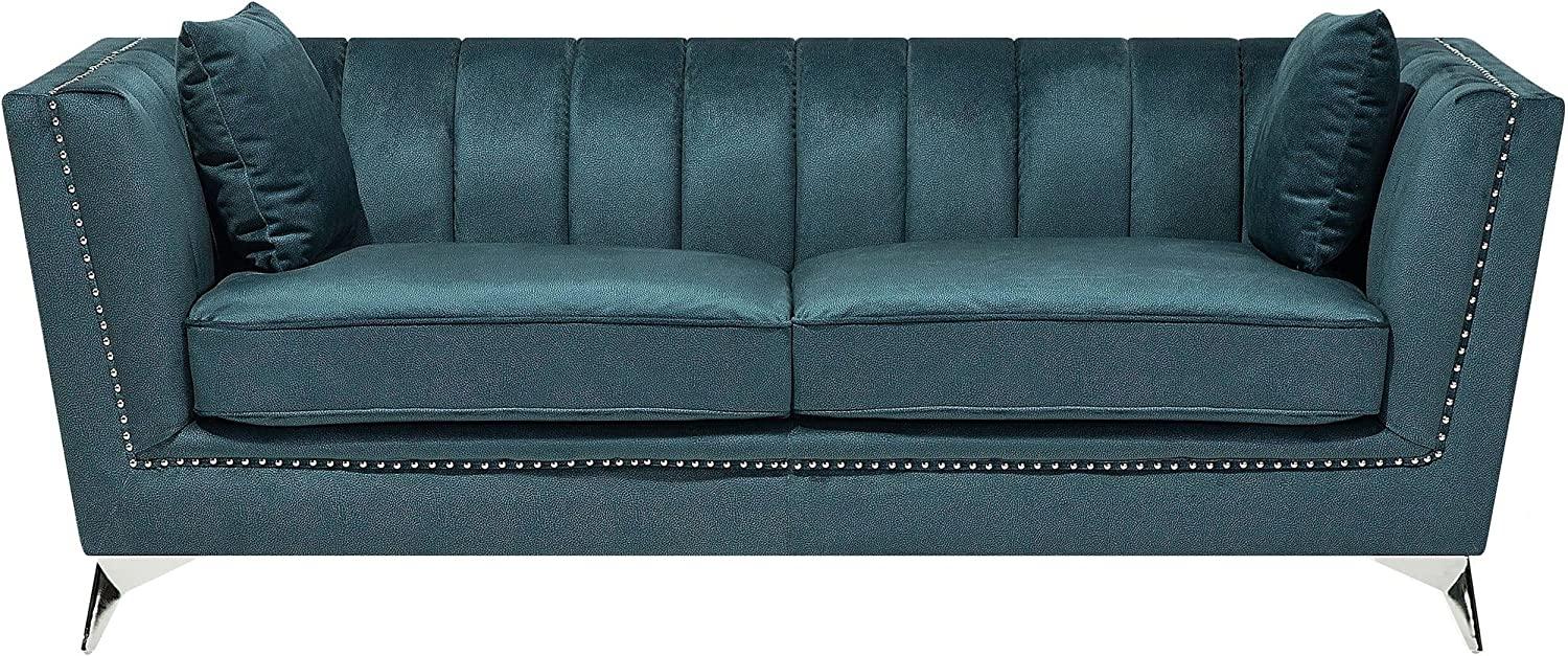 Luxuriöses 3-Sitzer Sofa GAULA in blau-grünem Samtstoff. Dieses elegante Sofa vereint modernen Glamour mit hervorragendem Komfort. Der weiche Polyester-Bezug und die stilvollen Metallfüße verleihen dem Möbelstück eine edle Ausstrahlung. Vertikale Steppungen an der Rückenlehne und silberne Nieten betonen die Konturen und machen das Sofa zu einem Blickfang in jedem Wohnbereich. **Highlights** - Luxuriöser Samtstoffbezug für ein elegantes Design - Stilvolle Nieten-Umrandung betont die Konturen des Sofas - Hochwertiges Material für ausgezeichneten Komfort - Rundumbezug ermöglicht freie Platzierung im Raum - Wellenfederung für optimalen Sitzkomfort **Produkteigenschaften** - Typ: 3-Sitzer Sofa - Stil: Glamourös - Farbe: Blaugrün - Material: Samtstoff (100% Polyester) - Füllmaterial: Schaumstoff (Schaumstoffdichte: 30 kg/m³) - Armlehnen: Gerade, ja - Rückseite mit Polsterbezug: ja - Muster: Kein Muster - Sitzkonstruktion: Wellenfederung - Anzahl Sitzplätze: 3 Personen - Abmessungen: - Höhe: 77 cm - Breite: 211 cm - Tiefe: 80 cm - Sitzhöhe: 49 cm - Sitzfläche: 166 x 59 cm - Dicke der Polsterauflagen: 17 cm - Gewicht: 52 kg - Max. Belastung p.P: 80 kg - Höhe Armlehnen: 77 cm **Lieferumfang** - 1 x Sofa - 2 x Zierkissen