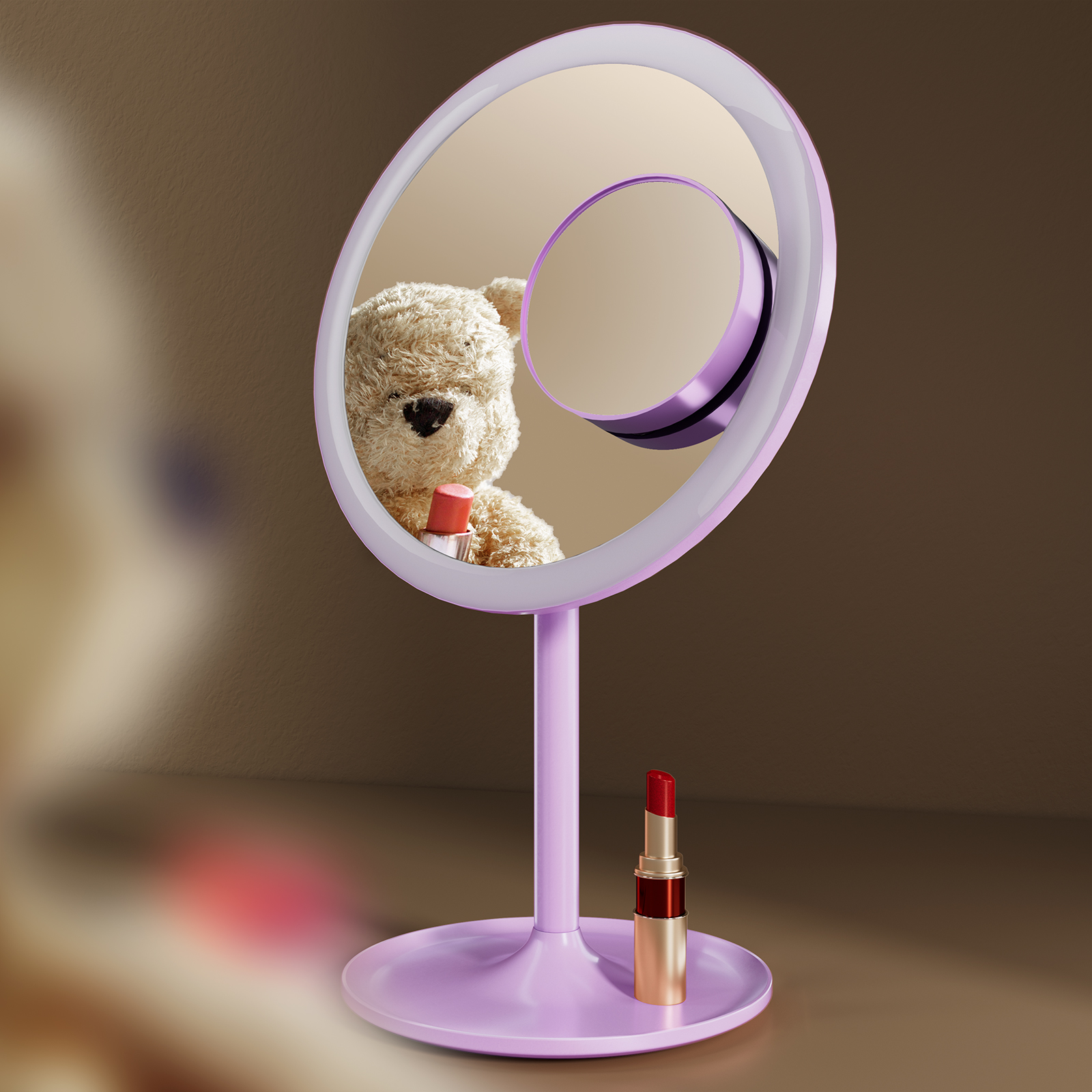 Der EMKE Kosmetikspiegel mit Beleuchtung ist ein vielseitiger und praktischer Begleiter für Ihr Make-up-Ritual. Mit einem wiederaufladbaren 2000 mAh Lithium-Akku und einer Ladezeit von nur 3,5 Stunden bietet er Ihnen die Freiheit, ihn überall zu nutzen. Der Spiegel verfügt über 46 LEDs und drei Lichtfarben, die sich per Touch-Schalter anpassen lassen. Dank der 90°-Drehbarkeit und des abnehmbaren 3-fach-Vergrößerungsspiegels ist er ideal für präzise Anwendungen. **Highlights** - 90° drehbarer Rahmen für optimale Anpassung - 3 Lichtfarben: warm, neutral, kalt - Wiederaufladbarer 2000 mAh Akku für kabellosen Einsatz - Automatische Abschaltung nach 30 Minuten zur Energieeinsparung - Inklusive abnehmbarem 3-fach Vergrößerungsspiegel **Produkteigenschaften** - Farbe: Violett - Anzahl der Lichter: 46 - Batteriekapazität: 2000 mAh - Externe Stromversorgung: Micro USB - Eingangsspannung: 5 V - Ladezeit: 3,5 h - Photometrischer Speicher: Ja - Farbtemperaturspeicher: Ja - Dimmfunktion: warmes - neutrales - kaltes Licht **Lieferumfang** - 1 x LED-Schminkspiegel - 1 x 1 m USB-Kabel - 1 x Benutzerhandbuch