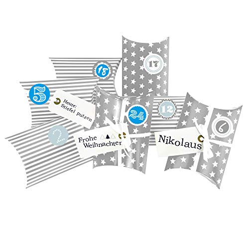 in AdventskalenderFrau WUNDERVoll® DIY Adventskalender zum Befüllen ChristkindKissenschachteln 15x11x4,5cm grau Sterne und Streifen, Ziffern blau/Weihnachten, Papiertüten, Kinder, Zahlen, Geschenkbeutel, Aufkleber
