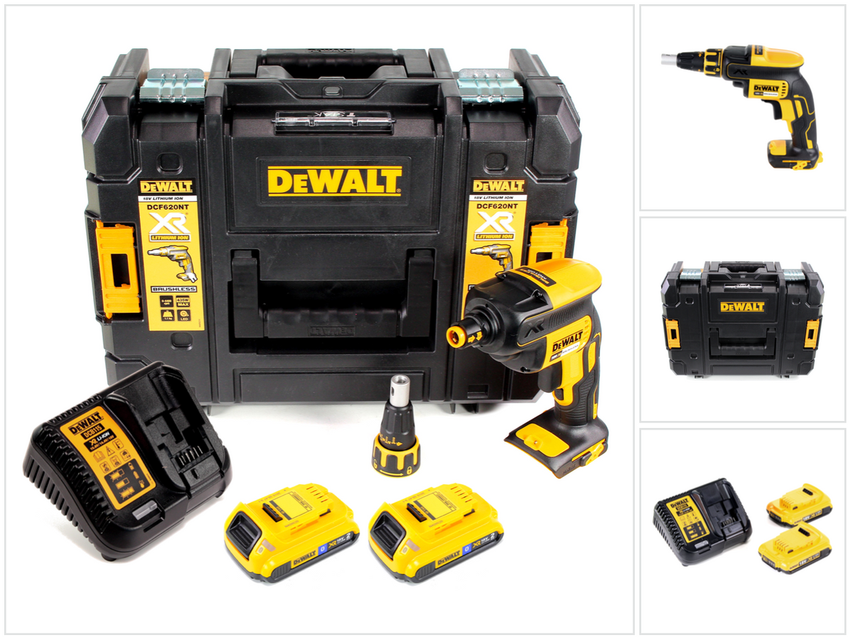 | Lieferumfang | 1x DeWalt DCF 620 Li-Ion 18 Volt bürstenloser Trockenbauschrauber- 2x DeWalt DCB 183 18V 2,0 Ah Li-Ion Akku- 1x DeWalt DCB 113- 1x TSTAK II Systemkoffer- 1x magnetischer Bithalter mit Ph2-Schrauberbit- 1x Schraubtiefenanschlag |