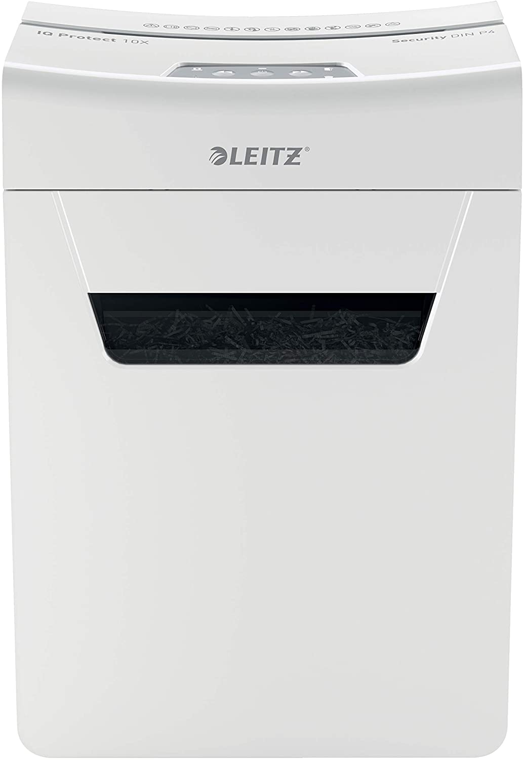 - Der LEITZ IQ 10X Protect Premium Aktenvernichter bietet einen Partikelschnitt P-4 mit einer Partikelgröße von 4 x 40 mm, was eine hohe Sicherheit beim Zerkleinern vertraulicher Dokumente gewährleistet.