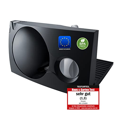 Energiesparmotor mit 170 Watt, rutschfester Standfuß, kompakte Bauweise, Schnittstärken einstellbar von 0 bis 2 cm, inklusive Schinkenmesser.