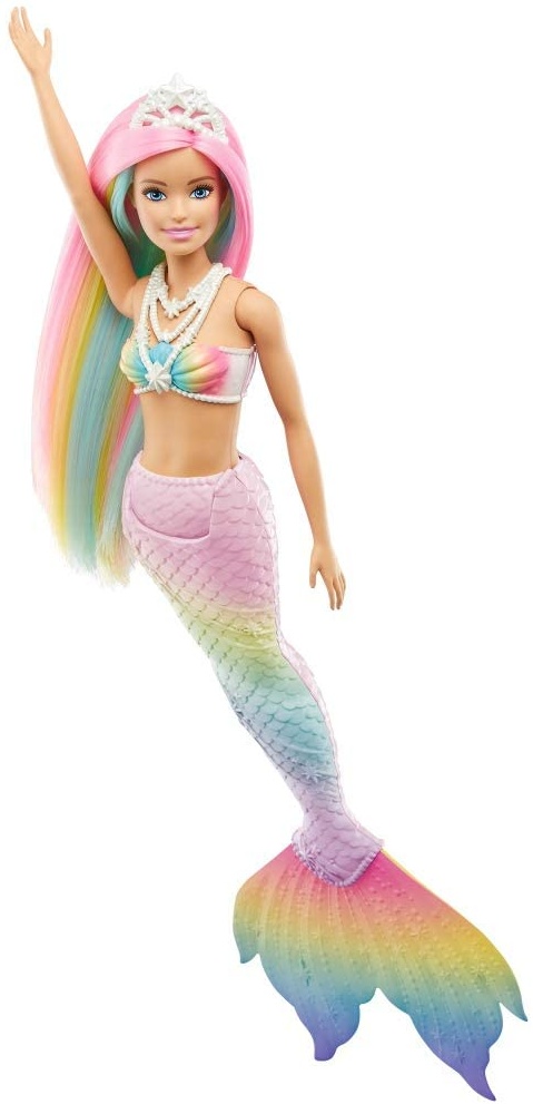 - Die Barbie Dreamtopia Regenbogenzauber Meerjungfrau Puppe verfügt über farbenfrohes Regenbogenhaar.