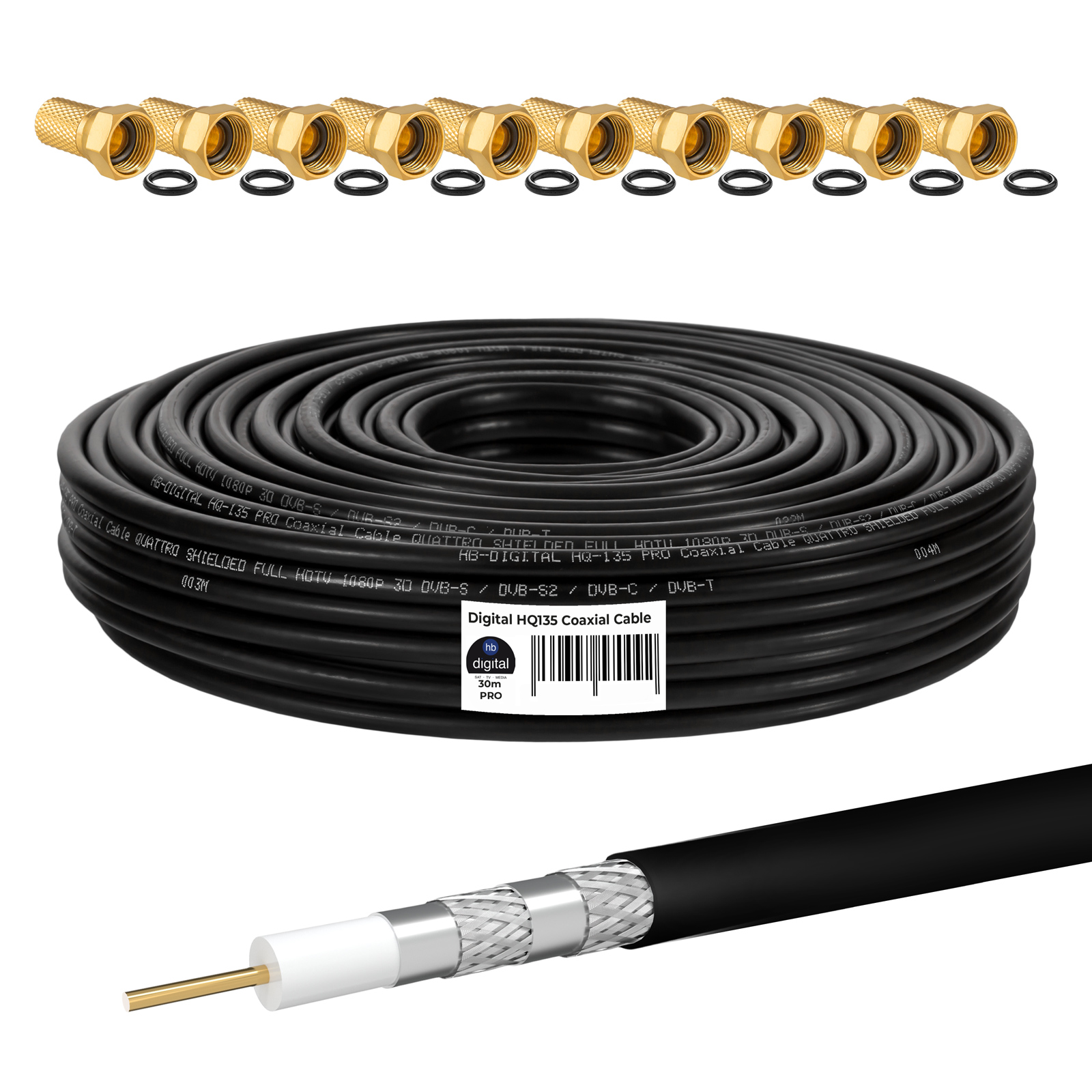 30 m 135 HQ Koaxial Kabel SCHWARZ + 10 x F-Stecker