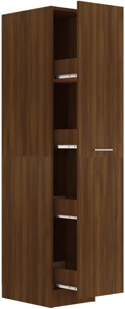 Der vidaXL Apothekerschrank in Braun mit Eichen-Optik bietet Ihnen mit seinen kompakten Maßen von 30 x 42,5 x 150 cm aus Holzwerkstoff viel Stauraum für eine optimale Organisation. Das pflegeleichte und ausziehbare Design sorgt für einfache Handhabung, während die hochwertige Qualität mit glatter Oberfläche sowie die stabilen und feuchtigkeitsbeständigen Eigenschaften für Langlebigkeit garantieren. **Highlights** - Viel Stauraum für optimale Organisation - Pflegeleichter Holzwerkstoff - Ausziehbares Design für einfache Handhabung - Hochwertige Qualität mit glatter Oberfläche - Stabile und feuchtigkeitsbeständige Eigenschaften **Produkteigenschaften** - Farbe: Braun Eichen-Optik - Material: Holzwerkstoff - Abmessungen: 30 x 42,5 x 150 cm (B x T x H)