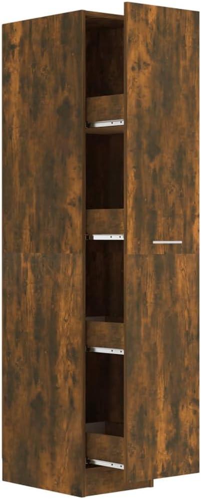 Der vidaXL Apothekerschrank in Räuchereiche ist die ideale Lösung für Ordnung und Stauraum in Ihrem Zuhause. Mit seinen kompakten Abmessungen von 30 x 42,5 x 150 cm bietet er ausreichend Platz für Ihre Utensilien. Der pflegeleichte Holzwerkstoff sorgt für eine glatte Oberfläche, die Festigkeit, Stabilität und Feuchtigkeitsbeständigkeit vereint. Das ausziehbare Design erleichtert das Finden von Gegenständen und macht diesen Schrank zu einem praktischen Möbelstück. **Highlights** - Bietet reichlich Stauraum - Pflegeleichter Holzwerkstoff - Ausziehbares Design für einfaches Finden von Gegenständen - Hochwertige Qualität mit glatter Oberfläche - Farbe: Räuchereiche **Produkteigenschaften** - Material: Holzwerkstoff - Abmessungen: 30 x 42,5 x 150 cm (B x T x H)