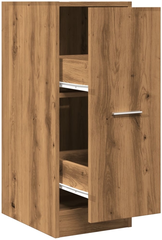 vidaXL Apothekerschrank Artisan-Eiche 30 x 41 x 77,5 cm aus Holzwerkstoff ist eine stilvolle und praktische Ergänzung für Ihr Zuhause oder Büro. Mit zwei Schubladen und einer robusten Konstruktion bietet dieser Schrank ausreichend Stauraum für Ihre täglichen Utensilien. Die hochwertige Verarbeitung und die eleganten Griffe sorgen für eine einfache Handhabung und einen schnellen Zugriff auf Ihre Gegenstände. **Highlights** - Starkes und langlebiges Material: Widerstandsfähig gegen Feuchtigkeit, Verformung und Rissbildung. - Reichlich Stauraum: Bietet Platz für die geordnete Aufbewahrung Ihrer Dinge. - Einfache Verwendung: Ausgestattet mit hochwertigen Metallschienen und eleganten Griffen. - Vielseitig einsetzbar: Ideal als Küchenschrank, Beistellschrank oder Büroschrank. - Belastbarkeit: Obere Ablage bis 45 kg, pro Schublade bis 5 kg, gesamt bis 65 kg. **Produkteigenschaften** - Farbe: Artisan-Eiche - Material: Holzwerkstoff - Gesamtabmessungen: 30 x 41 x 77,5 cm (B x T x H) - Abmessungen der Schubladen: 21,5 x 33,5 x 9 cm (B x T x H) - Anzahl der Schubladen: 2 - Zusammenbau erforderlich: Ja **Lieferumfang** - Apothekerschrank - Wandhalterung zur Sicherung des Schranks - Anleitung (Schrauben und Dübel für die Wandbefestigung nicht enthalten)