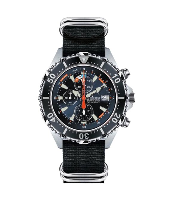 - Die Chris Benz CBC300XNBNBS Taucheruhr hat ein robustes Edelstahlgehäuse in silberner Farbe