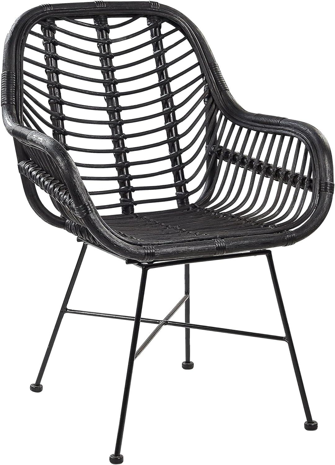 Formschöner Rattanstuhl in elegantem Schwarz, ideal für Ihr Esszimmer. Die geschwungene Sitzschale aus robustem Rattan bietet eine luftige Struktur und hohen Komfort. Das schlanke Metallgestell sorgt für Stabilität und verleiht dem Stuhl eine stilvolle Note. Mit einer maximalen Belastung von 120 kg und handgefertigter Präzision ist dieser Stuhl sowohl funktional als auch ästhetisch ansprechend. **Highlights** - Bequeme Sitzfläche für hohen Komfort - Gemütliche Ausstrahlung, die gute Laune verbreitet - Handgefertigte Präzision für hohe Qualität - Schutzkappen zum Schutz des Bodens - Geschwungene Armlehnen für zusätzlichen Komfort **Produkteigenschaften** - Typ: Esszimmerstuhl - Stil: Boho - Farbe: Schwarz - Gestellfarbe: Schwarz - Material: Rattan - Gestellmaterial: Metall - Sitzmaterial: Rattan - Armlehnen: Ja - Finish: Matt - Maße (HxBxT): 89 x 64 x 51 cm - Sitzhöhe: 44 cm - Sitzfläche: 41 x 40 cm - Höhe Armlehnen: 64 cm - Gewicht: 5 kg - Max. Belastung: 120 kg - Stapelbar: Nein **Lieferumfang** - 1 x Stuhl - Beine/Füße nicht montiert