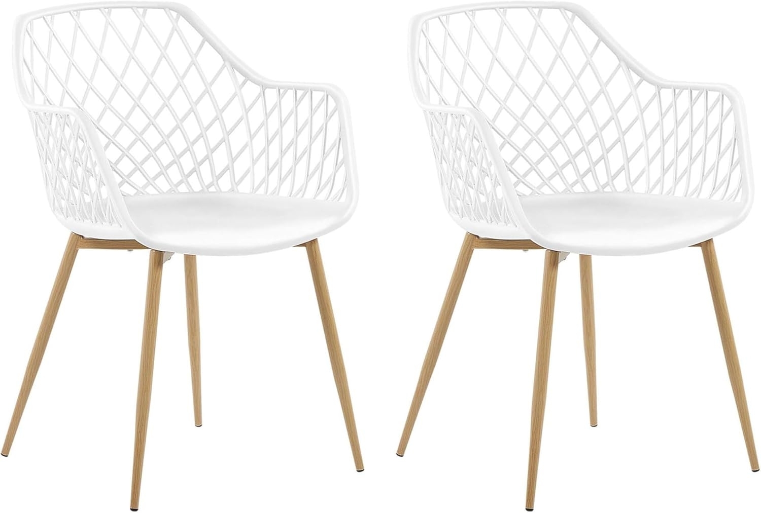 Moderner Esszimmerstuhl im 2er Set NASHUA in elegantem Weiß. Die pflegeleichten Kunststoff-Sitzflächen und Rückenlehnen bieten hohen Komfort und behalten ihren frischen Look. Das ansprechende Rautendesign und die Metallbeine in Holzoptik sorgen für Stabilität und Stil. Ideal für Küche, Esszimmer oder Bar. **Highlights** - Pflegeleichter Kunststoff für langfristige Nutzung - Bequem geformte Armlehnen für zusätzlichen Komfort - Edles Rautendesign als Blickfang - Metallbeine in Holzoptik für Stabilität - Max. Belastung von 150 kg **Produkteigenschaften** - Typ: Esszimmerstuhl - Stil: Modern - Farbe: Weiß - Gestellfarbe: Heller Holzfarbton - Material: Kunststoff - Gestellmaterial: Metall - Sitzmaterial: Kunststoff - Armlehnen: Ja - Finish: Matt - Abmessungen: - Höhe Armlehnen: 71 cm - Tiefe: 51 cm - Sitzhöhe: 46 cm - Breite: 50 cm - Höhe: 86 cm - Sitzfläche: 44 x 39 cm - Gewicht: 5 kg - Max. Belastung: 150 kg - Stapelbar: Nein **Lieferumfang** - 2 x Stühle - Beine/Füße nicht montiert