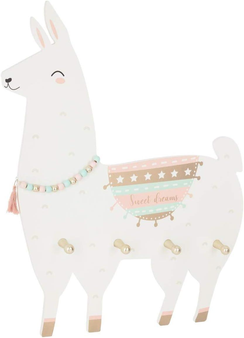 Eine kinderfreundliche Garderobe mit 4 Haken und einem universellen Kleiderbügel in Weiß mit Pastellelementen. Ideal für das Kinderzimmer, mit lustiger Form und langlebiger Qualität. Diese Wandgarderobe in Lamaform ist ästhetisch gestaltet und bietet vier hängende Klammern. **Highlights** - Lustiges Lama-Design - Pastellfarben für ein kinderfreundliches Ambiente - Vier praktische Haken für Kleidung - Universell einsetzbar in verschiedenen Räumen - Liebe zum Detail bei der Gestaltung **Produkteigenschaften** - Ästhetisches Design - Pastellfarben - Vier hängende Klammern - Wandmontage - Universelle Verwendung