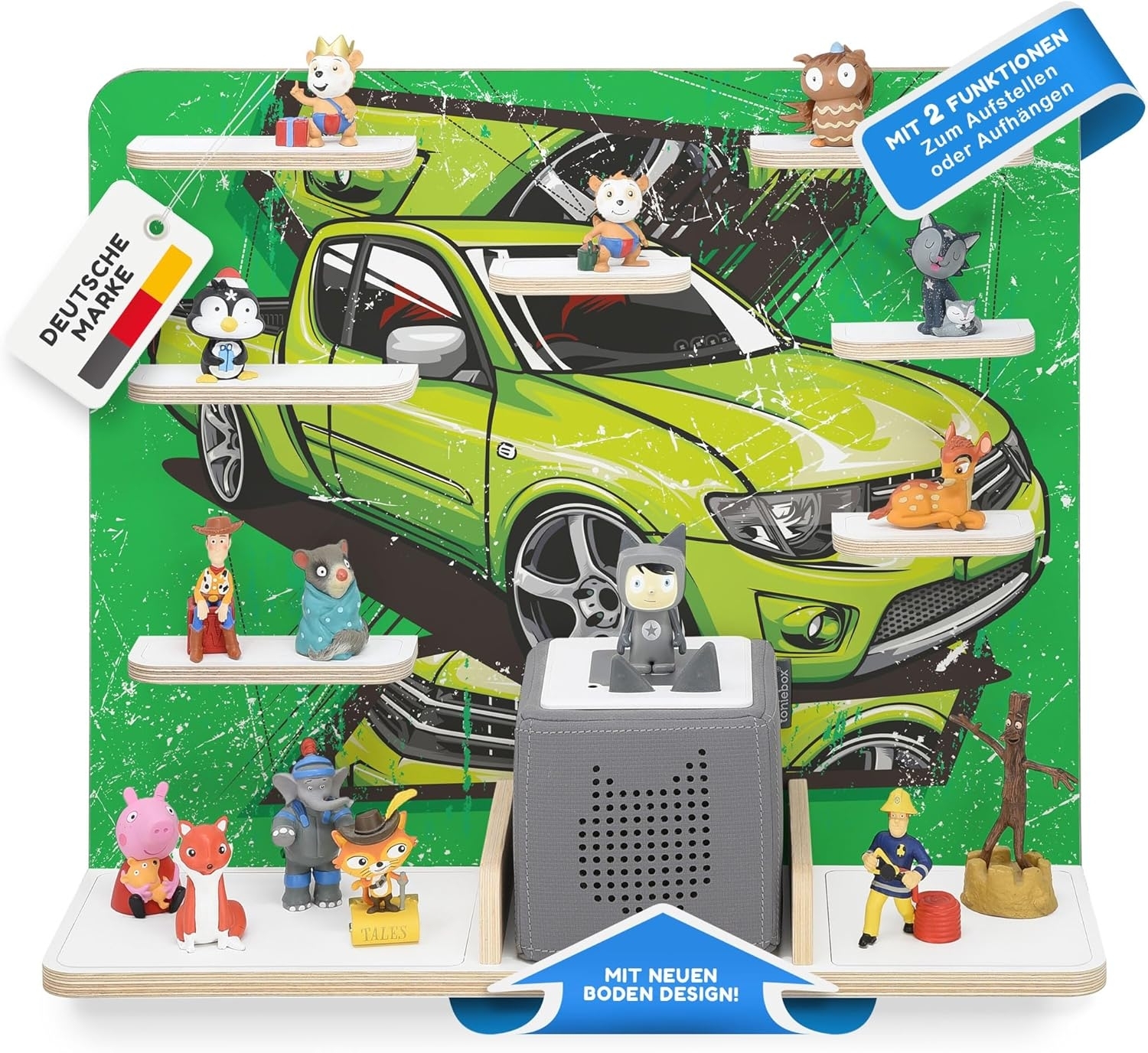 Das Kinderregal Pick up ist ideal für die Toniebox und bietet Platz für ca. 50 Tonies. Hergestellt aus hochwertigen Multiplex-Platten, sind die Ecken und Kanten sorgfältig gerundet, um Sicherheit zu gewährleisten. Die Motive sind mittels UV-Digitaldruck auf der 10 mm Holzplatte aufgebracht. Dank der eingebauten Metallbleche haften die Figuren magnetisch, während der abgekantete Rahmen für einen sicheren Stand der Musikbox sorgt. **Highlights** - Platz für ca. 50 Tonies - Magnetfunktion für sicheren Halt der Figuren - Ecken und Kanten sind gerundet für mehr Sicherheit - Hochwertige Multiplex-Platten für Langlebigkeit - Individuelle Gestaltungsmöglichkeiten durch Aufstellen oder Aufhängen **Produkteigenschaften** - Material: Multiplex-Platten - Maße: 10 mm Holzplatte - Druckverfahren: UV-Digitaldruck - Farbe: lichtechte Farben mit hoher Farbbrillanz **Lieferumfang** - Regal für die Toniebox - Musikbox und Figuren sind nicht im Lieferumfang enthalten