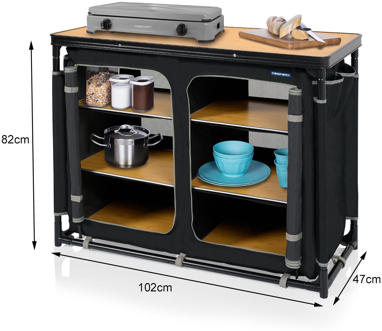Der faltbare Campingschrank ZARAGOZA ist der perfekte Begleiter für Camping, Urlaub oder zu Hause. Mit einem cleveren Klappsystem lässt er sich schnell auf- und abbauen. Der Schrank bietet sechs Fächer sowie zusätzliche Staufächer an den Seiten und ist aus strapazierfähigem 600D Polyester gefertigt. Die elegante Arbeitsplatte in Holzoptik und die verstellbaren Füße sorgen für Stabilität, auch auf unebenen Böden. **Highlights** - Praktischer faltbarer Campingschrank - Sechs Fächer und zusätzliche Staufächer für viel Stauraum - Arbeitsplatte in eleganter Holzoptik - Strapazierfähiges 600D Polyester und belüftete Rückwand - Verstellbare Füße für stabilen Stand auf unebenen Böden **Produkteigenschaften** - Abmessungen: 102 x 47 x 82 cm - Material: 600D Polyester, Aluminiumgestell - Gewicht: 9,3 kg - Packmaß: 103,5 x 9,5 x 48,5 cm **Lieferumfang** - Campingschrank ZARAGOZA - Aufbewahrungstasche