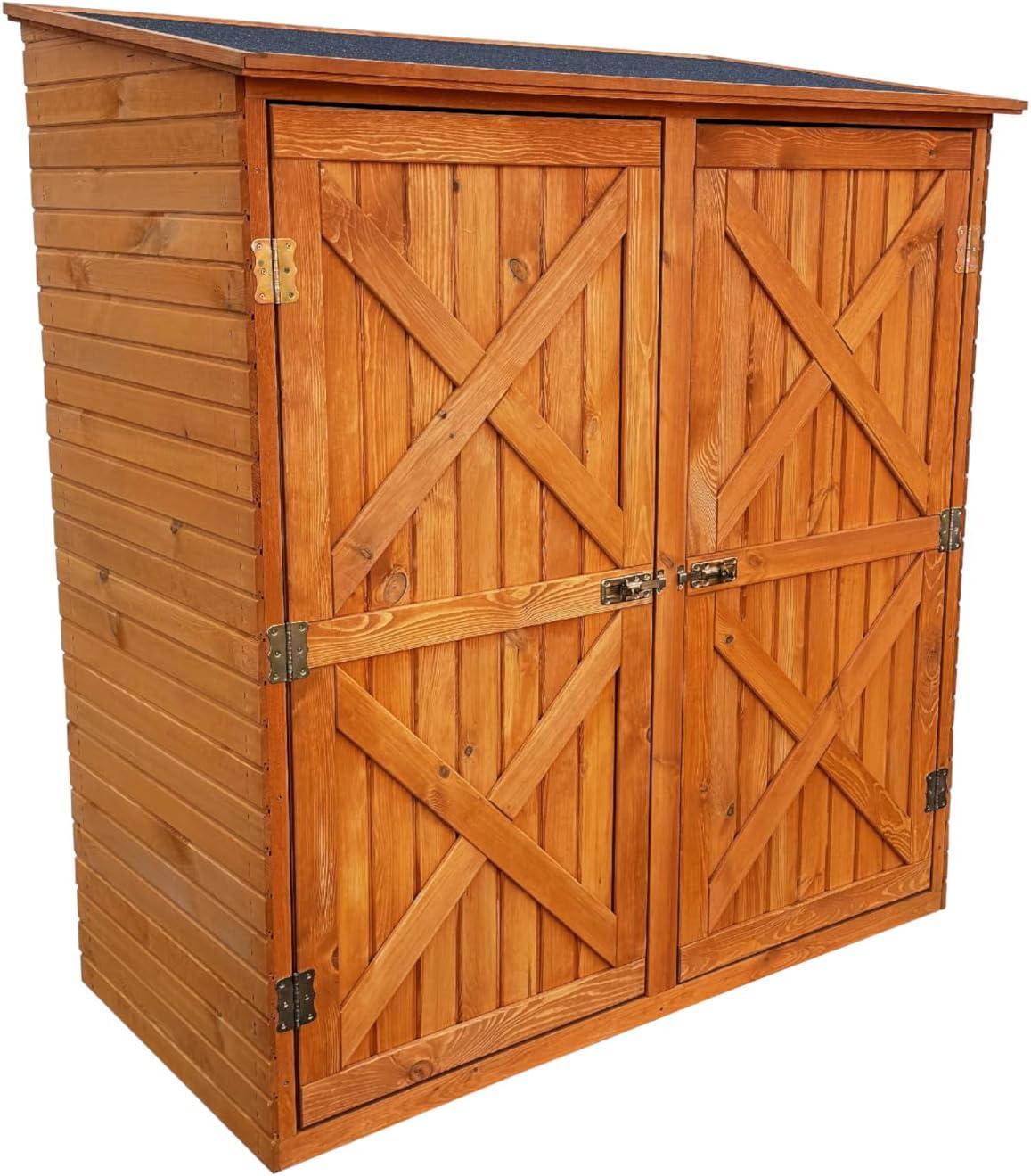 Der Geräteschrank Pforzheim groß von PROMADINO bietet Ihnen optimalen Stauraum für kleine Gartengeräte und sorgt für eine aufgeräumte Optik in Ihrem Garten. Hergestellt aus wetterfest imprägniertem Kiefernholz, verfügt er über ein mit Dachpappe gedecktes Dach und ein praktisches Regal im Innenraum. **Highlights** - Stabiler wetterfester Holzschrank - Elegantes Design aus massivem Kiefernholz - Mit praktischem Regal im Innenraum - Dach mit Dachpappe gedeckt - Maße: 149 x 72 x 164 cm (L/B/H) **Produkteigenschaften** - Material: Kiefernholz - Farbe: honigbraun - Maße: 149 x 72 x 164 cm (L/B/H) - Wetterfest imprägniert - Mit Regal im Innenraum