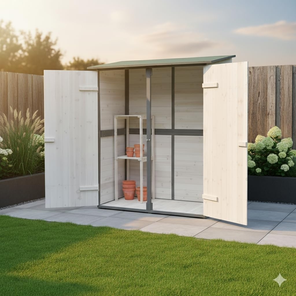 - Das XXL Gerätehaus in Weiß/Grau bietet eine stilvolle und praktische Lösung zur Aufbewahrung von Gartenutensilien und Werkzeugen.