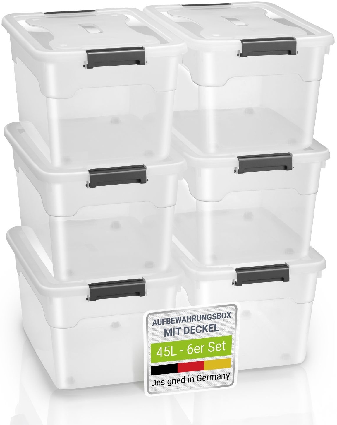 - Das 6er Set Aufbewahrungsboxen hat ein Fassungsvermögen von 45 Litern pro Box, was viel Platz für verschiedene Gegenstände bietet.