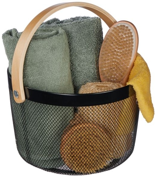 Runder Drahtkorb mit Henkel 10045990_46 ist der ideale Aufbewahrungs-Allrounder für Ihr Zuhause. Mit kompakten Maßen von ca. 17,5 x 27,5 x 26,5 cm (H x B x T) und einer Höhe von ca. 30 cm mit Henkel bietet er vielseitigen Stauraum für Kosmetik, Gästehandtücher oder Kleidung. Der moderne Mix aus Stahl und Holz sorgt für einen ansprechenden Look, während das offene Design einen guten Überblick über den Inhalt ermöglicht. **Highlights** - Praktisches Aufbewahrungskörbchen für zu Hause - Vielseitig nutzbar in Bad, Küche, Wohnzimmer etc. - Offenes Design aus Metalldraht bietet guten Überblick über Inhalt - Henkel aus Holz setzt optische Kontraste zum Metallkörbchen - Max. Traglast: 5 kg **Produkteigenschaften** - Maße (H x B x T, Griff runtergeklappt): ca. 17,5 x 27,5 x 26,5 cm - Höhe mit Henkel: ca. 30 cm - Innenmaße (H x D): ca. 17x25 cm - Gewicht: ca. 400 g - Material: Stahl, Holz **Lieferumfang** - 1x Metall-Aufbewahrungskorb in Farbe nach Wahl - Dekoartikel sind im Lieferumfang nicht enthalten