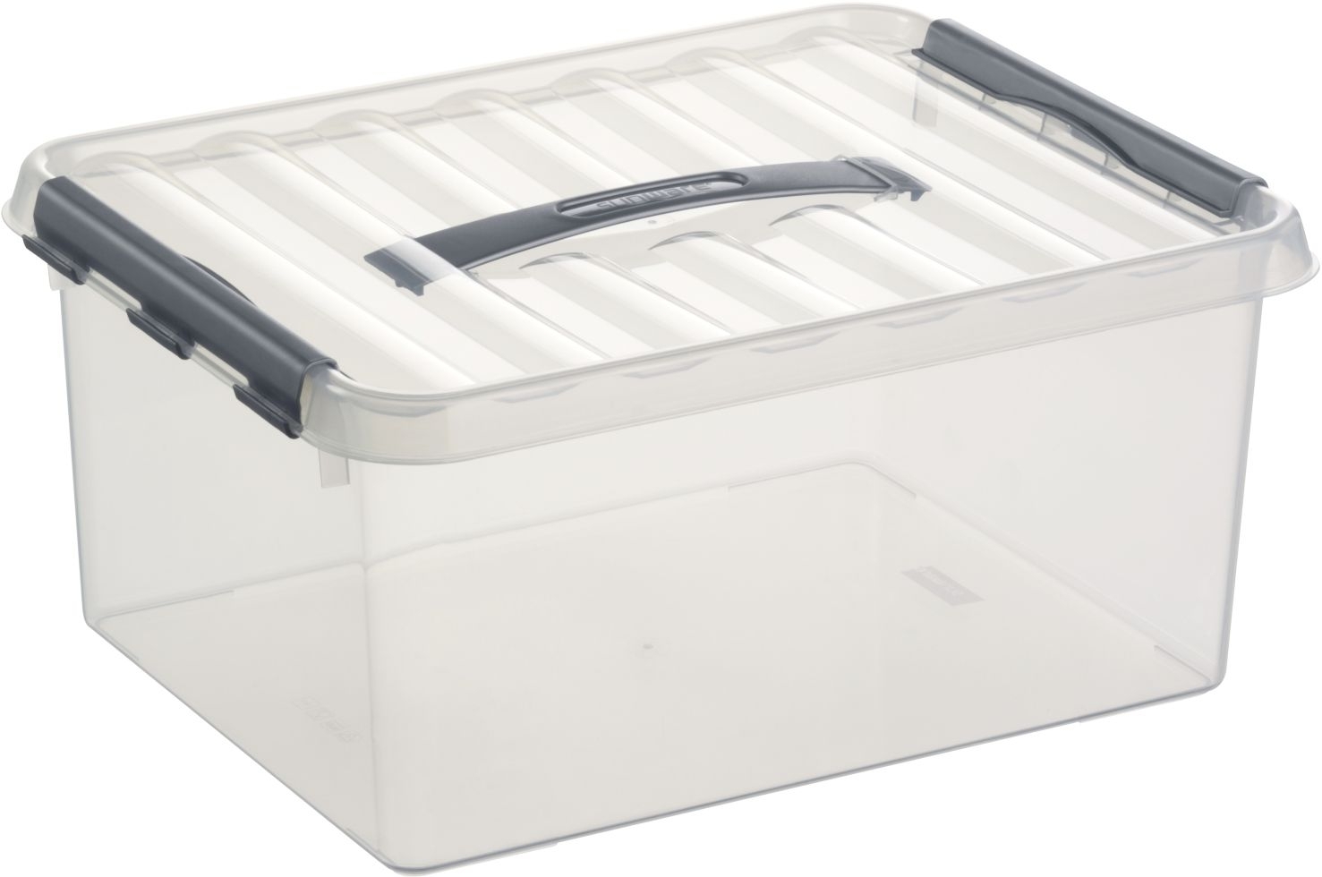Die Sunware Aufbewahrungsbox 15L ist ideal für die ordentliche und staubfreie Lagerung von Unterlagen, Kleidung und Spielsachen. Mit den kompakten Maßen von 40 x 30 x 18 cm (L x B x H) bietet sie ausreichend Platz für verschiedene Gegenstände. Der transparente Deckel ermöglicht einen schnellen Überblick über den Inhalt, während der Clip-Verschluss für eine sichere Fixierung sorgt. Hergestellt aus stabilem Kunststoff, ist die Box robust und langlebig. **Highlights** - Staubfreie Aufbewahrung von Unterlagen, Kleidung und Spielsachen - Transparenter Deckel für schnellen Überblick über den Inhalt - Clip-Verschluss für sichere Fixierung - Stapelbar und passend für das Regalsystem Q-Line 15L - Hergestellt aus stabilem Kunststoff **Produkteigenschaften** - Maße: 40 x 30 x 18 cm (L x B x H) - Farbe: transparent/metallic - Material: Kunststoff - Stabil und langlebig - Nestbar - Mit Griff - Inklusive Deckel **Lieferumfang** - 1 Box mit 2 Clipsen und 1 Deckel