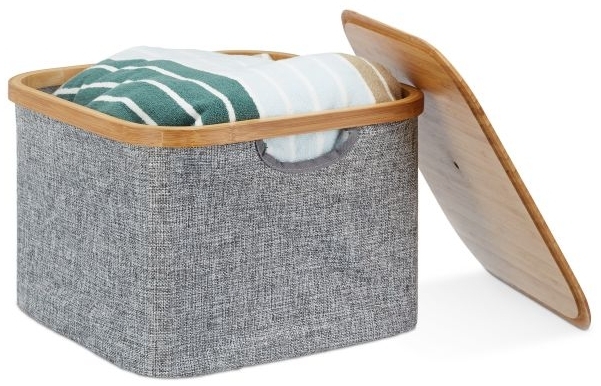 Praktischer Aufbewahrungskorb aus grauem Stoff mit einem Deckel aus Bambus. Ideal zum Verstauen von Badutensilien, Spielzeug und Zeitschriften. Das schlichte Design im Landhausstil fügt sich harmonisch in jeden Raum ein. Bei Nichtgebrauch lässt sich der Korb einfach zusammenfalten und platzsparend verstauen. **Highlights** - Deckel aus Bambus schützt Gegenstände im Inneren vor Staub - Integrierte Griffe für bequemes Herausziehen aus dem Regal - Bei Nichtgebrauch zusammenfalten und platzsparend verstauen - Vielseitig einsetzbar für verschiedene Gegenstände - Schlichtes Design im Landhausstil **Produkteigenschaften** - Maße H x B x T: ca. 25 x 33 x 33 cm - Innenmaße H x B x T: ca. 22 x 30 x 30 cm - Maße zusammengefaltet H x B x T: ca. 3,5 x 34 x 34 cm - Gewicht: ca. 1 kg - Material: Stoff, Bambus - Farbe: Grau, Natur **Lieferumfang** - 1x Aufbewahrungskorb in Einzelteilen - Dekorationsartikel sind nicht im Lieferumfang enthalten