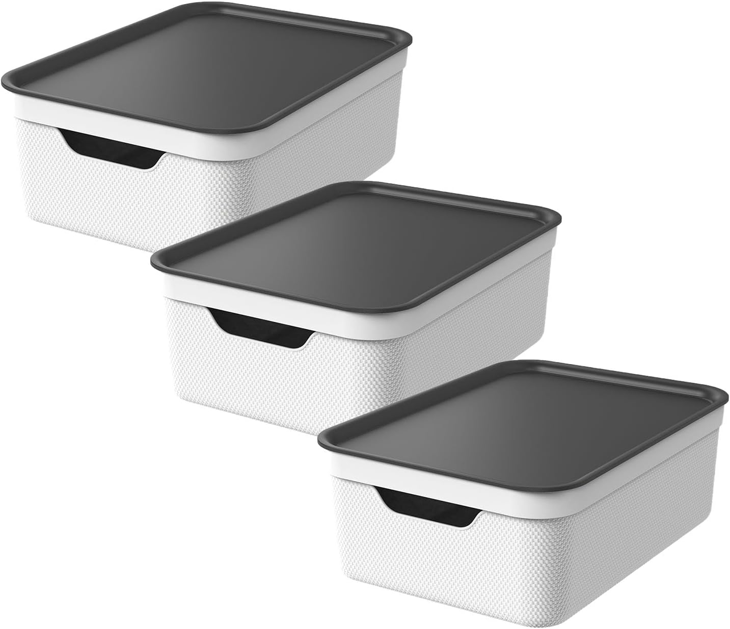 Praktisches 3er-Set Aufbewahrungsboxen mit Deckel aus Kunststoff in Weiß. Jede Box hat ein Volumen von 10 l und eignet sich ideal zur Ablage von DIN A4 Papier. Das zeitlose Design wurde mit dem Red Dot Design Award 2021 ausgezeichnet. Die Boxen sind stapelbar und können platzsparend ineinander nestbar aufbewahrt werden. Mit bequemen Griffen ausgestattet, passen sie optimal in jedes Regal. **Highlights** - Red Dot Design Award 2021: Ausgezeichnetes, zeitloses Design - Stapelbar: Spart Platz und ermöglicht eine effiziente Nutzung - Bequeme Griffe: Erleichtert das Tragen und Handhaben - Ideal für DIN A4 Papier: Perfekte Größe für Dokumente - Platzsparend ineinander nestbar: Praktische Aufbewahrung, wenn nicht in Gebrauch **Produkteigenschaften** - Set mit 3 Boxen à 10 l - Maße (LxBxH): 37,5 x 27,8 x 13 cm - Farbe: Weiß mit anthrazitfarbenem Deckel - Material: Kunststoff **Lieferumfang** - 3 Aufbewahrungsboxen mit Deckel - Keine weiteren Produkte enthalten