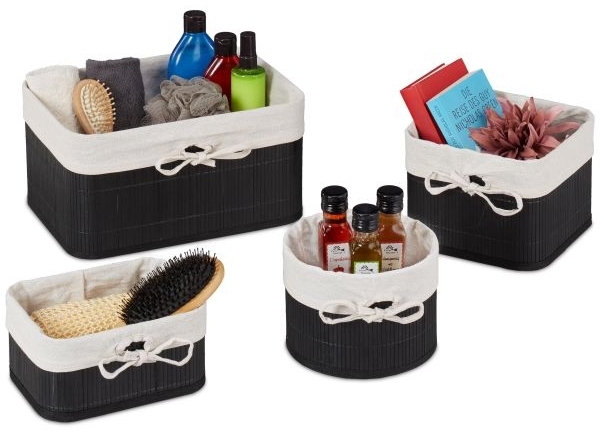 Die Aufbewahrungskörbe im 4er Set aus Bambus (Artikelnummer: 10041514) bieten eine stilvolle und praktische Lösung zur Organisation Ihrer Räume. Mit robusten Körben und abnehmbarem Polyesterbezug schützen sie den Inhalt und fügen sich harmonisch in Bad, Wohnzimmer oder Kinderzimmer ein. Die Körbe sind in verschiedenen Größen erhältlich und bieten vielseitigen Stauraum für Ihre Alltagsgegenstände. **Highlights** - Robuste Bambuskörbe mit abnehmbarem Polyesterbezug - Vielseitig einsetzbar in verschiedenen Räumen - Natürliches Design aus dunklem Bambus - Herausnehmbares Innenfutter aus Stoff - Vielfältiger Stauraum in 4 verschiedenen Größen **Produkteigenschaften** - Großer rechteckiger Korb: 17 x 33 x 23 cm, 0,47 kg - Kleiner rechteckiger Korb: 10,5 x 20,5 x 15,5 cm, 0,21 kg - Quadratischer Korb: 15 x 20 x 20 cm, 0,28 kg - Runder Korb: 13 x 18 cm, 0,19 kg - Traglast je Korb: 5 kg - Materialien: Bambus, Polyester, MDF-Platte - Farbe: Schwarz, Creme **Lieferumfang** - 4x Korb in verschiedenen Größen