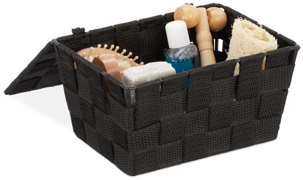 Der Aufbewahrungskorb mit Deckel in Schwarz ist die ideale Lösung zur diskreten Aufbewahrung von Badartikeln. Mit den Maßen von ca. 10,5 x 19,5 x 14,5 cm und einem Volumen von ca. 1,8 l bietet er ausreichend Platz für verschiedene Utensilien. Der geflochtene Badkorb aus pflegeleichtem Kunststoff ist vielseitig einsetzbar und eignet sich perfekt für Bad, Schlafzimmer oder Wohnzimmer. **Highlights** - Diskrete Aufbewahrung mit Deckel - Vielseitig einsetzbar in verschiedenen Räumen - Robuster Kunststoff für Feuchtigkeitsbeständigkeit - Schöne Flechtoptik für verschiedene Verwendungszwecke - Praktisches 2er Set für mehr Ordnung **Produkteigenschaften** - Maße: ca. 10,5 x 19,5 x 14,5 cm - Volumen: ca. 1,8 l - Gewicht: ca. 190 g - Material: Kunststoff (PP) - Farbe: Schwarz **Lieferumfang** - 2x Aufbewahrungskorb mit Deckel - Dekoartikel sind nicht im Lieferumfang enthalten