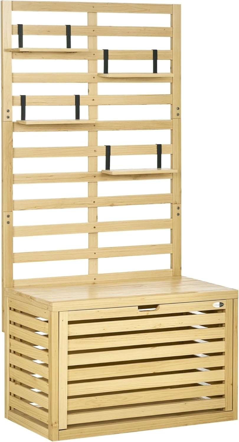 Diese praktische und rustikale Gartenbox von Outsunny ist ideal für Ihren Außenbereich. Hergestellt aus massivem Tannenholz und wetterfest lackiert, bietet sie reichlich Stauraum für Spielzeug und Gartenzubehör. Das integrierte Spalier unterstützt Kletterpflanzen, während die vier Hängeregale flexibel platziert werden können. Zudem kann die Box als Sitzbank für eine Person genutzt werden. **Highlights** - Integriertes Spalier für Kletterpflanzen - Vier flexible Hängeregale für Blumentöpfe - Wetterfest lackiert für Langlebigkeit - Kann als Sitzbank für eine Person verwendet werden - Magnetverschluss für die Klappe **Produkteigenschaften** - Farbe: Natur - Material: Tannenholz - Gesamtmaße: 80 x 45 x 160 cm - Maße Aufbewahrungsbox: 74 x 37 x 43 cm - Maße Spalier: 80 x 110 cm - Maße je Regal: 29,5 x 9,5 cm - Belastbarkeit: 120 kg - Montage erforderlich **Lieferumfang** - 1 x Aufbewahrungsbox mit Spalier - 4 x Regale - 1 x Anleitung