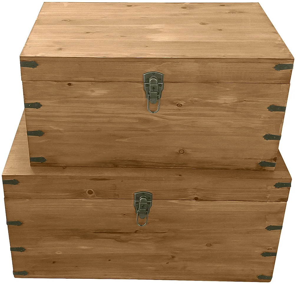 Entdecken Sie das 2er-Set Koffer MALOUEN aus Tannenholz und MDF, das Ihnen vielseitige Aufbewahrungslösungen bietet. Mit den Maßen 70 x 46 x 35 cm und 60 x 38 x 30 cm sind diese Koffer ideal für die Aufbewahrung von Büchern, Souvenirs oder Textilien. Das natürliche Holz verleiht Ihrem Zuhause ein warmes, vintage Ambiente und sorgt für einen authentischen Touch. **Highlights** - Aus Tannenholz gefertigt für eine natürliche Optik - Vintage-Design, das Ihrem Zuhause Charme verleiht - Viel Stauraum für Bücher, Souvenirs und Textilien - Montiert geliefert für sofortige Nutzung - Verschlusssystem mit Schnallen für sicheren Verschluss **Produkteigenschaften** - Farbe: Naturfarben hell - Material: Tanne - Stärke des Holzes: 9 mm - Maße Koffer 1 (HxBxT): 35 x 70 x 46 cm - Maße Koffer 2 (HxBxT): 30 x 60 x 38 cm **Lieferumfang** - 2 Koffer (70 x 46 x 35 cm und 60 x 38 x 30 cm) - Montiert geliefert - Ausschluss von optionalem Zubehör