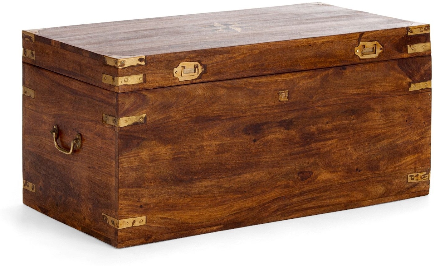 Die Truhe Merlin II kombiniert ländlichen Charme mit edlem Design. Gefertigt aus hochwertigem Palisander, auch bekannt als Sheesham oder indisches Rosenholz, bietet sie eine robuste Bauweise und eine ansprechende Optik in verschiedenen Brauntönen. Die lackierte Oberfläche verleiht zusätzlichen Glanz, während die auf dem Deckel eingebrachte Windrose einen besonderen Akzent setzt. Mit den Maßen 87 x 45 x 48 cm ist diese Truhe eine stilvolle Bereicherung für jedes Zuhause. **Highlights** - Aus hochwertigem Palisander gefertigt - Lackierte Oberfläche in verschiedenen Brauntönen - Ländlich-rustikales Design - Auf dem Deckel eingebrachte Windrose - Robuste Bauweise für langlebige Nutzung **Produkteigenschaften** - Material: Palisander (Sheesham, indisches Rosenholz) - Maße (HxBxT): 48 x 87 x 45 cm - Verwendung: Exquisite Landhausmöbel - Ideal für robuste Wohnlandschaften