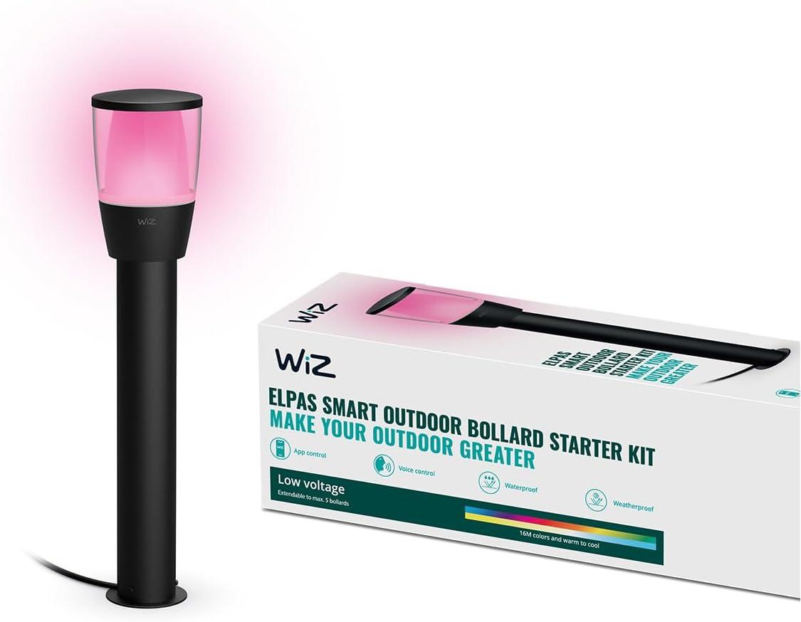 Die WiZ Elpas Sockel Start B Tunable White&Color 300 lm in Schwarz ist eine moderne LED-Pollerleuchte für den Außenbereich. Sie bietet über 16 Millionen Farben und einstellbares Weißlicht, um eine besondere Atmosphäre in Ihrem Garten oder auf der Terrasse zu schaffen. Dank der wasserbeständigen Bauweise und der einfachen WLAN-Steuerung ist sie ideal für den Außenbereich geeignet. **Highlights** - Sofortige Einrichtung des smarten Lichtsystems über WLAN - Matter zertifiziert für Sicherheit und Schutz - Millionen Farben und dynamische Modi für individuelle Stimmungen - Niedervolttechnologie und einfache Installation - Geeignet für Garten und Terrasse **Produkteigenschaften** - Schutzklasse: IP65 - Gehäusematerial: Metall, Kunststoff - Dimmbar - Energieeffizienzklasse: D - Durchschnittliche Lebensdauer: 25000 Stunden - Lichtfarbe: RGB - Lichtstrom max.: 400 lm - Farbtemperatur min.: 2700 K - Farbtemperatur max.: 5000 K - CRI/Ra-Wert: 80 - Anzahl Leuchtmittel: 1 - Art des Leuchtmittels: Fest verbautes Leuchtmittel - Lichtstrom bei 2700 K: 300 lm - Eingangsspannung: 220 V - 240 V - Leistungsaufnahme Betrieb: 4,8 W - Farbe: Schwarz - Höhe: 51,8 cm - Länge/Tiefe: 10,85 cm - Breite: 10,85 cm - Gewicht: 1,4 kg **Lieferumfang** - WiZ Elpas Sockelleuchte - Erdspieß - Schrauben und Dübel - Netzteil - Hinweistext: Das abgebildete Zubehör und Endgeräte dienen nur zur Veranschaulichung und sind nicht im Lieferumfang enthalten.