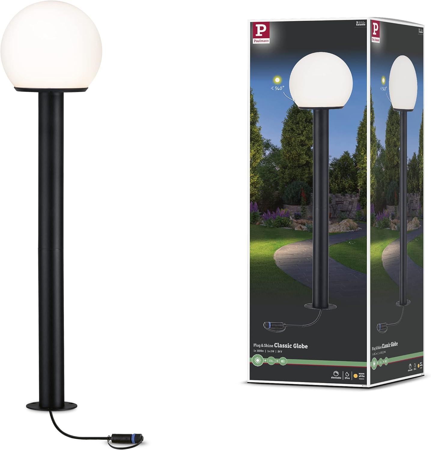 Die Paulmann No. 94321 Plug&Shine Poller Classic Globe IP44 24V in Anthrazit ist eine stilvolle Pollerleuchte mit nostalgischem Charme. Sie eignet sich ideal für Wege, Einfahrten und Gartenbereiche. Mit einer Höhe von 800 mm und einem Durchmesser von 200 mm bietet sie eine ansprechende Lichtquelle. Die dimmbare Leuchte hat eine maximale Leistung von 10 W, eine Spannung von 24 V und wird inklusive einer austauschbaren 2 Watt Lichtquelle geliefert. **Highlights** - Klassisches Design - Nostalgische Optik mit Erdspieß in Globenform - Dimmbar für individuelle Lichtstimmung - Kompatibel mit Zubehör aus der Plug & Shine Serie - Austauschbare Lichtquelle **Produkteigenschaften** - Höhe: 800 mm - Durchmesser: 200 mm - Farbe: Anthrazit - Material: Metall - Leistung: max 10 W - Spannung: 24 V - Sockel, Fassung: E14 - IP Schutz: IP44 - Schutzklasse: III - Lichtfarbe: 3000 K - Nennlichtstrom: 160 lm - Energieeffizienzklasse: E - Gewicht: 2046 g **Lieferumfang** - 1 x Paulmann No. 94321 Plug&Shine Poller Classic Globe IP44 24V Anthrazit E14 80cm - Inklusive Lichtquelle