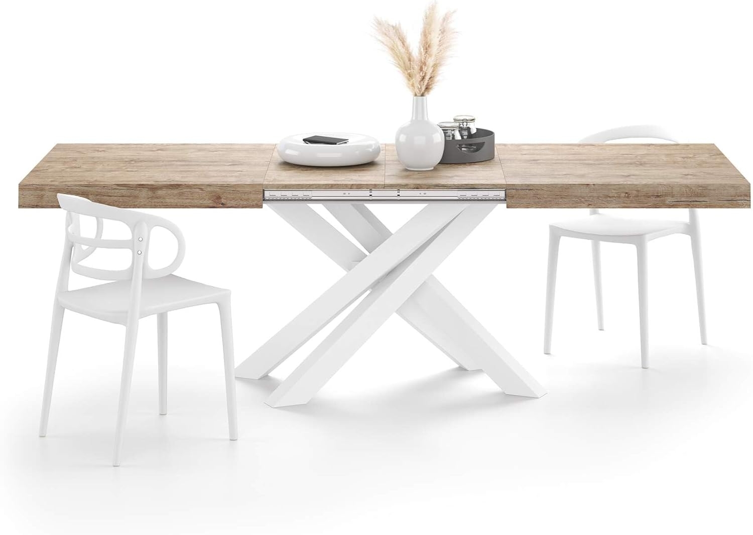 MOBILI FIVERAusziehbarer Tisch Emma 160, Eiche mit weißen X-Beinen, Laminiert/Eisen, Made in Italy