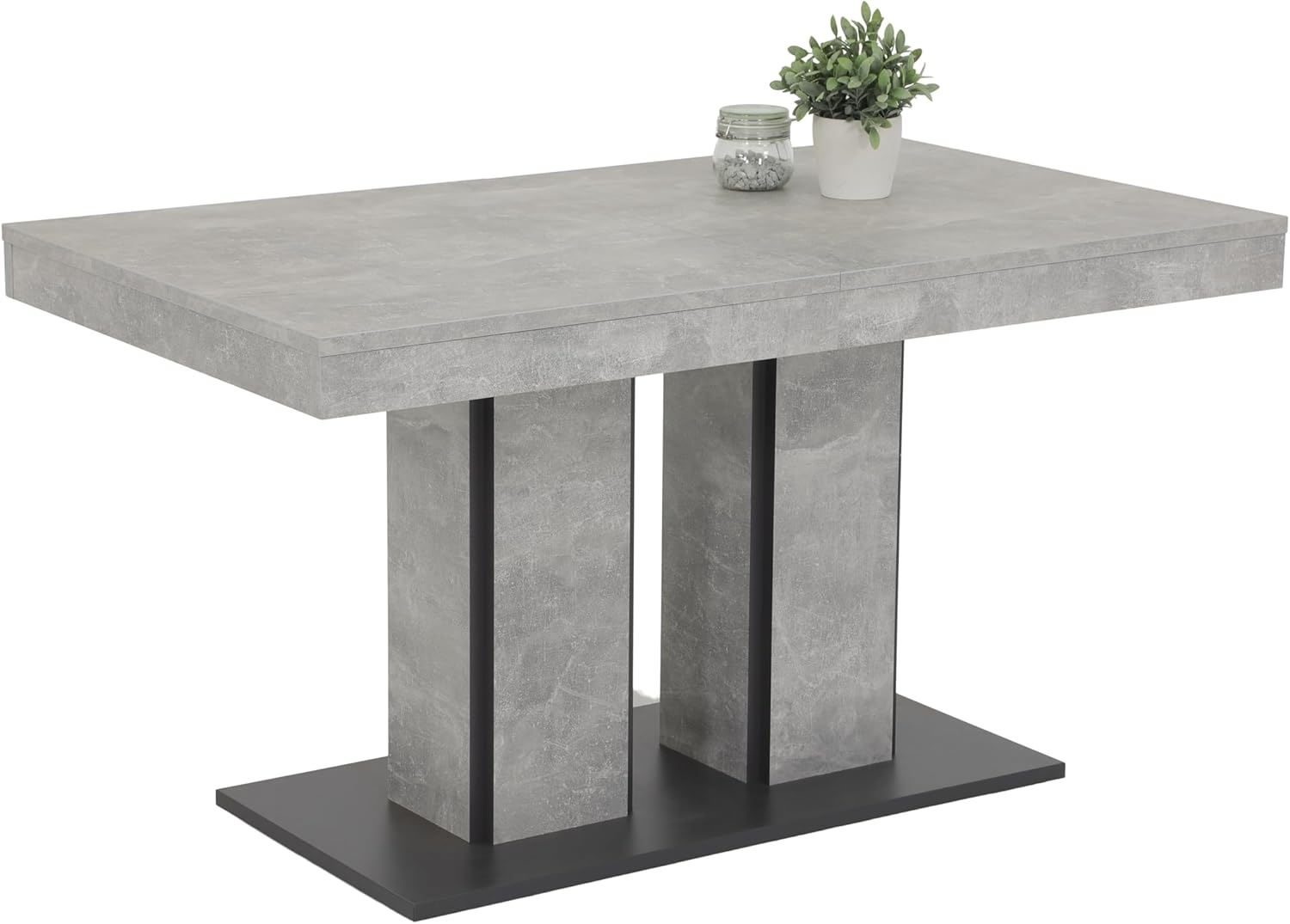 Der Esstisch 'Rose' in Betonoptik vereint modernes Design mit Funktionalität. Mit einem stabilen Säulengestell und einer ausziehbaren Tischplatte bietet er Platz für Familie und Freunde. Die breite Zarge und das Zwei-Säulen-Design verleihen dem Tisch eine massive Optik. **Highlights** - Ausziehfunktion für zusätzlichen Platz - Stabilität durch das Säulengestell - Breite Zarge für ein massives Erscheinungsbild - Tischplatte mit innenliegender Einlegeplatte - Modernes Design in Betonoptik **Produkteigenschaften** - Material: Dekorholz - Farbe: Betonoptik mit anthrazitfarbenen Applikationen - Maße: - Breite: 140 / 180 cm - Tiefe: 80 cm - Höhe: 76 cm **Lieferumfang** - 1x Esstisch Rose ausziehbar - Betonoptik Anthrazit - Artikel wird zerlegt geliefert - Dekorationsartikel sind nicht im Lieferumfang enthalten