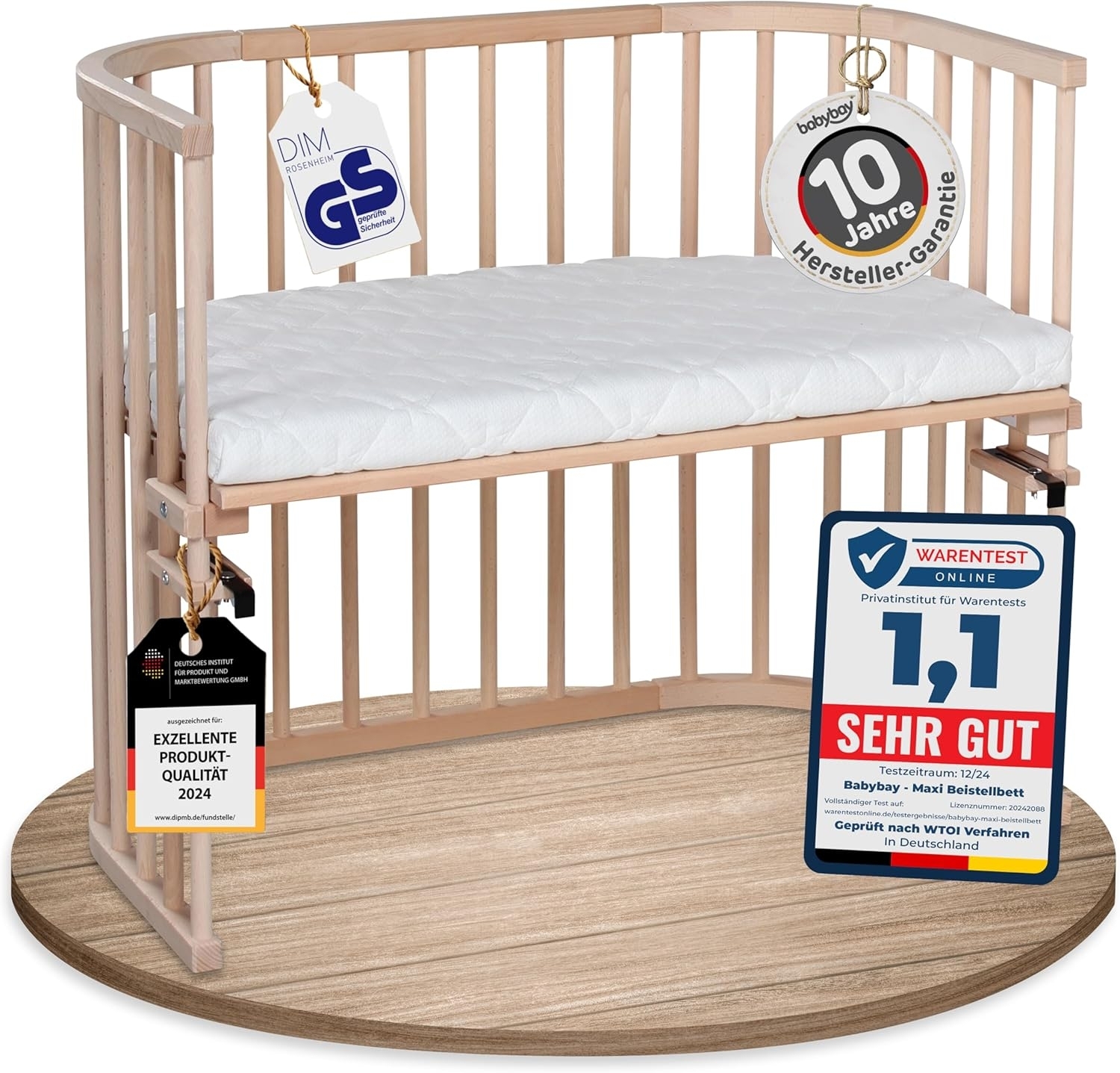 Das babybay Maxi Beistellbett in natur unbehandelt bietet eine stufenlose Höhenverstellung für eine exakte Anpassung an das Elternbett. Es ist flexibel und sicher zu befestigen, ideal auch für Zwillinge. Das langlebige Design ermöglicht eine Umwandlung in eine Sitzbank oder einen Spieltisch. Das Bett ist TÜV-geprüft, nachhaltig und bis 150 kg belastbar, gefertigt aus antibakteriellem Buchenholz aus heimischen Wäldern. **Highlights** - Stufenlos höhenverstellbar für eine perfekte Anpassung an das Elternbett - Flexibel und werkzeuglos zu befestigen, auch für Zwillinge geeignet - Langlebig und vielseitig verwandelbar in Sitzbank oder Spieltisch - TÜV-geprüft und mehrfach ausgezeichnet von Fachzeitschriften - Nachhaltig und sicher, bis 150 kg belastbar **Produkteigenschaften** - Liegefläche: großzügig gestaltet - Material: massives, antibakterielles Buchenholz - Lacke: schadstofffrei und speichelfest - Befestigung: spezielle, sichere Fixierung am Elternbett **Lieferumfang** - babybay Maxi Beistellbett - Matratze Classic Soft
