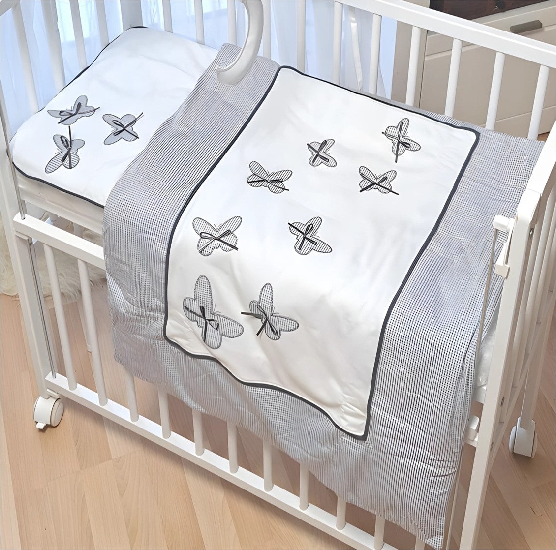 4-teiliges Babybettwäsche-Set „Schmetterlinge Grau“ aus 100 % Bio-Baumwolle. Das zarte Schmetterlings-Design in Grau sorgt für einen natürlichen Look und ist ideal für einen erholsamen Babyschlaf. Die Bettwäsche ist hautfreundlich, atmungsaktiv und eignet sich für Babybetten mit den Maßen 120x60 cm sowie für Beistellbetten und Wiegen. **Highlights** - 100 % Bio-Baumwolle: weich, atmungsaktiv, sanft zu empfindlicher Haut - Antiallergische Füllung: silikonisiertes Polyestervlies für wohltuende Wärme ohne Überhitzen - Sichere Reißverschlüsse: Kunststoff-Zipper, leicht zu bedienen - Pflegeleicht: maschinenwaschbar bei 40 °C, langlebig - Geschenk-Ready: Lieferung in eleganter Box – perfekt zur Geburt oder Taufe **Produkteigenschaften** - Maße Steppdecke: 90x70 cm (Füllung: antiallergisch) - Maße Kissen: 33x44 cm (Füllung: antiallergisch) - Bezüge: 100 % Bio-Baumwolle - Füllungen: antiallergisches Polyestervlies - Wäsche: 40 °C Schonwaschgang, mit ähnlichen Farben - Nicht bleichen, nicht chemisch reinigen; schonend schleudern (≤ 800 U/min) **Lieferumfang** - 1 x Steppdecke - 1 x Kissen - 1 x Bettbezug passend zur Decke - 1 x Kissenbezug passend zum Kissen - Bett und Matratze sind nicht enthalten