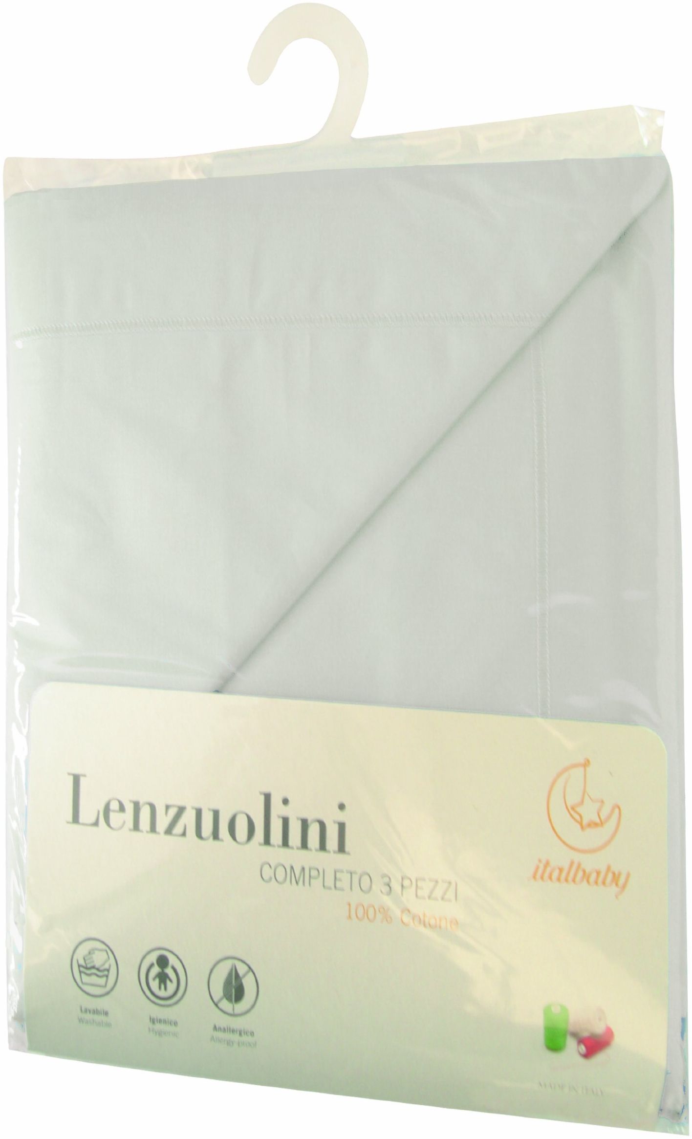 | Beschreibung | 3-teiliges Set für Kinderbett einfarbig weiß Maße Bettlaken 120x180 cm, Spannbetttuch 60x130 cm, Kissenbezug 40x60 cm. 100 % Baumwolle und mada in Italien |