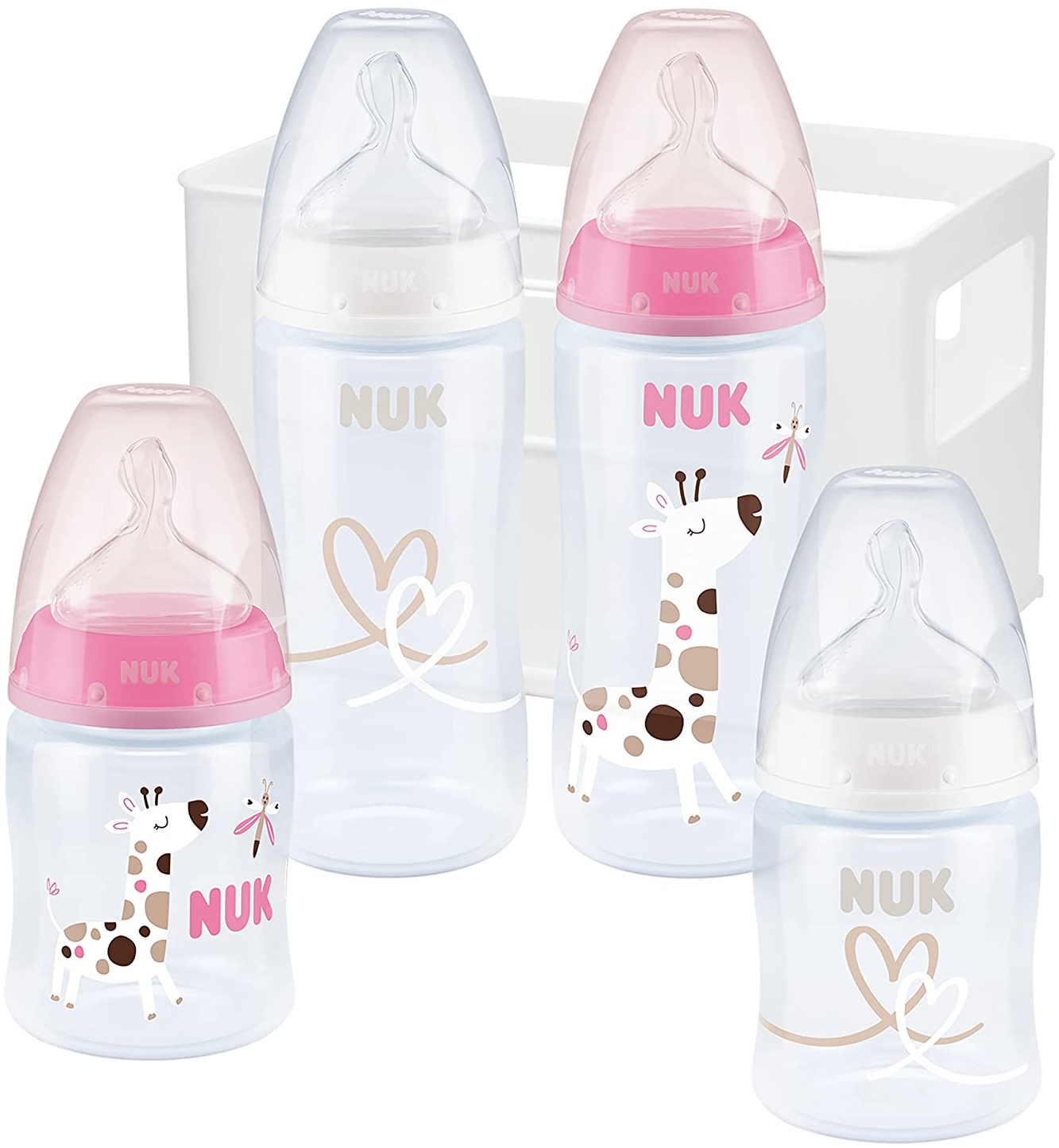 Von NUK gibt es als Erstausstattung das NUK First Choice+ Starter Set mit Temperature Control. Mit dem hochwertigen Set ist von Beginn an für alles gesorgt. Es enthält eine Flaschenbox zur Aufbewahrung von bis zu sechs NUK First Choice oder anderen NUK Babyfläschchen. Die Box besteht aus leichtem und sehr robustem Polypropylen (PP). Das Set enthält vier NUK First Choice+ Temperature Control Babyflaschen aus Polypropylen (PP) mit tollen Motiven: Für den kleinen Hunger zwei Flaschen mit jeweils 150ml und zwei weitere mit je 300ml Füllmenge. Die Babyfläschchen aus PP sind leicht und widerstandsfähig. Durch den griffigen Schraubring lassen sich die Fläschchen leicht öffnen und schließen. Der weite Flaschenhals ermöglicht ein einfaches Befüllen und Reinigen. Jede NUK First Choice+ Temperature Control Babyflasche im Starter Set ist mit einem kiefergerechten NUK Trinksauger aus Silikon mit natürlich breiter Lippenauflage bestückt, die deinem Baby beim Trinken ein vertrautes Gefühl wie an der Mutterbrust geben. Alle NUK First Choice+ Temperature Control Babyfläschchen sind für die Kombination von Stillen und Flaschenfütterung geeignet und wachsen mit – wenn dein Baby größer wird sind die Fläschchen ganz leicht mit anderen NUK First Choice Trinksaugern und -aufsätzen kombinierbar. Babyeinfach zur richtigen Temperatur – NUK First Choice+ Babyflaschen mit Temperature Control Ein gutes Gefühl! Wenn’s richtig rund geht, fühlt sich etwas zusätzliche Sicherheit einfach gut an. NUK First Choice+ Babyflaschen mit Temperature Control zeigen auf einen Blick, wenn die richtige Trinktemperatur erreicht ist. Mit Temperature Control verändert die Skala auf der Flasche ihre Farbe abhängig von der Temperatur des Inhalts. Ist die Nahrung zu heiß, wechselt die normalerweise blaue Anzeige auf weiß. Wichtig: NUK Temperature Control dient als zusätzliche Kontrolle. Deshalb sollte die Temperatur der Nahrung vor dem Füttern mit ein paar Tropfen aufs Handgelenk geprüft werden. Das Original Der original NUK Trinksauger ist der Form der Brustwarze beim Stillen nachempfunden. Sie lässt der Zunge und dem Kiefer deines Babys ausreichend Platz für die natürliche Saugbewegung. Natürliches Gefühl Mit ihrer neuen Soft Zone schmiegt sich die Spitze des Silikonsaugers noch besser an den Gaumen deines Babys – für ein natürliches Gefühl beim Trinken. Weniger Koliken Das NUK Anti-Colic Air System stellt einen natürlichen Trinkfluss sicher und hilft deinem Baby zu trinken, ohne Luft zu schlucken. Für ein glückliches kleines Bäuchlein. Klinisch getestet* Durch seine besonders natürliche Form wird der NUK Trinksauger von Säuglingen sehr gut akzeptiert. Damit eignet er sich auch für Babys, bei denen Stillen und Flaschenernährung miteinander kombiniert werden. Produktdetails: Design: Giraffe/Herz in rosa/weiß Mit Temperature Control Anzeige: Gibt Sicherheit, dass aus der Flasche nicht zu heiß gefüttert wird. Ist der Inhalt zu heiß, wird die Anzeige in der Skala weiß Besonders weicher, kiefergerechter Silikon-Trinksauger Weniger Kiliken – das NUK Anti-Colic Air System sorgt für einen natürlichen Nahrungsfluss Aus hochwertigem Polypropylen (PP), BPA frei, 150ml Inhalt Aus hochwertigem Polypropylen (PP), BPA frei, 300ml Inhalt Schadstofffrei und geruchlos, frei von Bisphenol A Flaschenbox aus hochwertigem Material – ideal als Abtropfhilfe nach der Reinigung und zur Aufbewahrung Einfaches Befüllen und Reinigen durch extra weiten Flaschenhals Sicherer Griff und Stand durch leicht taillierte Flaschenform mit breitem Flaschenboden Kombinierbar mit allen NUK First Choice⁺ Produkten Maße: Länge 14 cm x Breite 6,5 cm x Höhe 6,5 cm Gewicht: ca. 83 Gramm Maße: Länge 19,3 cm x Breite 6,5 cm x Höhe 6,5 cm Gewicht: ca. 106 Gramm Lieferumfang: 2 x 150ml NUK First Choice+ Temperature Control Babyflaschen aus Polypropylen (PP) mit Silikon-Trinksauger 0-6 Monate S (Tee, Muttermilch) 2 x 300ml NUK First Choice+ Temperature Control Babyflaschen aus Polypropylen (PP) mit Silikon-Trinksauger 0-6 Monate M (Milch) 1 x Flaschenbox in weiß