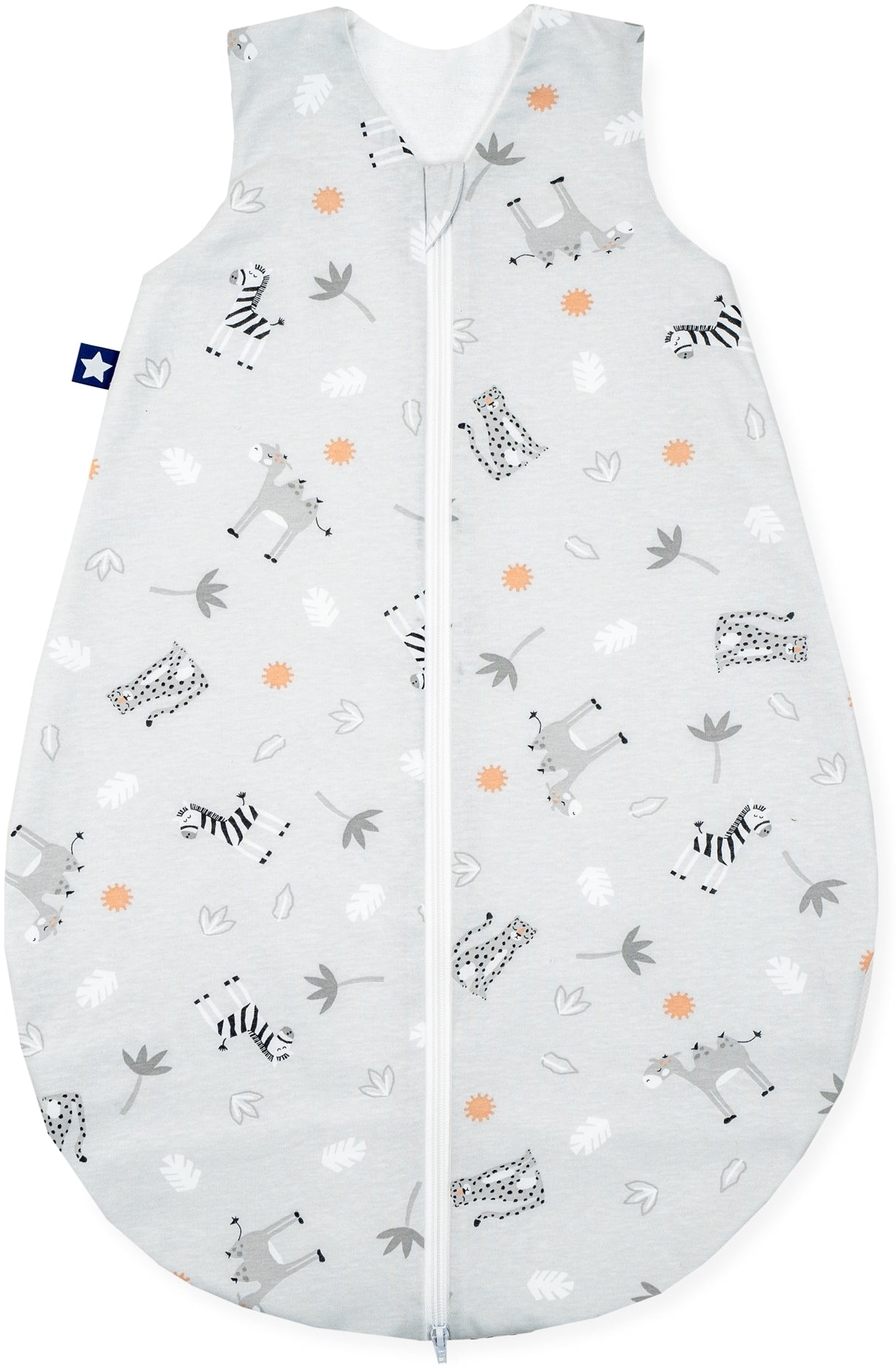 Der leichte Baby Sommerschlafsack aus weichem Jersey ist besonders anschmiegsam, sanft zur Haut und für warme Sommernächte geeignet (0,5TOG). Der robuste, mittlere Reißverschluss macht das Windelnwechseln zum Kinderspiel und ist ebenfalls für größere Kinder geeignet. ###### Produktdetails * leichter Schlafsack für warme Sommernächte (0,5 TOG) * Zertifiziert nach Standard 100 by OEKO-TEX®. * Hergestellt in Deutschland. ###### Der Babyschlafsack sollte möglichst passgenau sitzen und im Schulterbereich gut anliegen. Es sollten nicht weniger als 10cm Platz zwischen den Füßen und der Unterkante des Schlafsackes zur Verfügung stehen. ###### Material und Pflege + Außenmaterial 100% Baumwolle + waschbar bis 60°C, trocknergeeignet (Schongang) ######