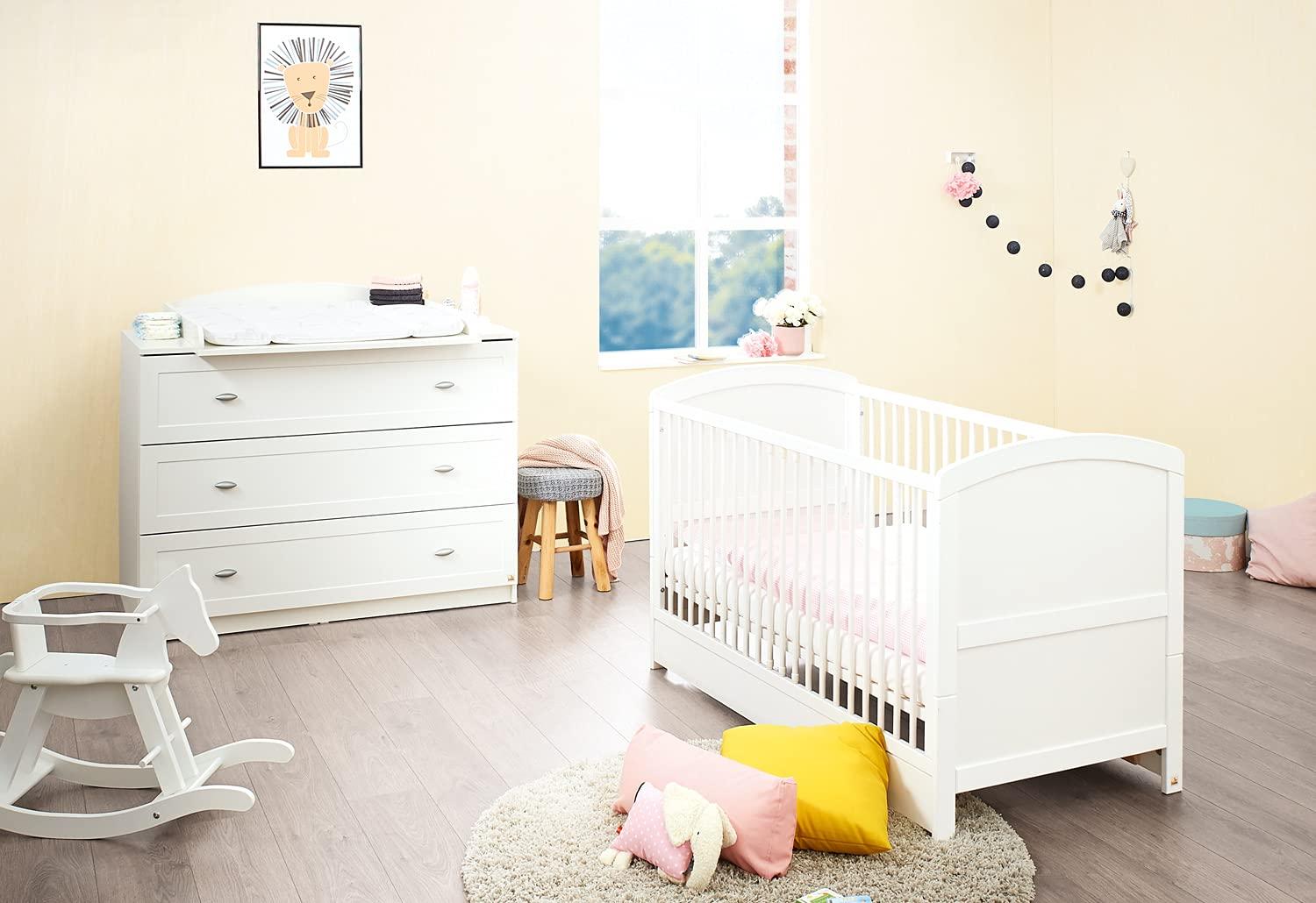 | Lieferumfang | Kinderbett inkl. höhenverstellbarem Lattenrost und Umbauseiten, Wickelkommode inkl. abnehmbarem Wickelansatz und 3 Schubkästen |