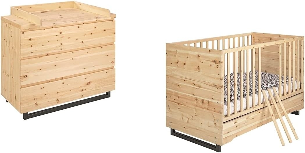 Das Schardt Zirbenholz 2-tlg. Babyzimmer-Set vereint Funktionalität und hochwertige Materialien. Es besteht aus einem Kombi-Kinderbett (70x140 cm) aus massivem, naturbelassenem Zirbenholz mit einem Bettkasten und einem höhenverstellbaren Rost. Zudem beinhaltet es eine Wickelkommode mit abnehmbarem Wickelaufsatz, die ebenfalls aus massivem Zirbenholz gefertigt ist. Beide Möbelstücke verfügen über ein schwarzes Massivholz-Fußgestell und bieten durchdachte Details wie Selbsteinzug und herausnehmbare Schlupfsprossen. **Highlights** - Kombi-Kinderbett mit Umbauseiten für eine lange Nutzungsdauer - Wickelkommode mit abnehmbarem Wickelaufsatz - Massives Zirbenholz für eine natürliche und gesunde Umgebung - 3-fach höhenverstellbarer Rost für individuelle Anpassung - Schubkästen mit Selbsteinzug für sanftes Schließen **Produkteigenschaften** - Kombi-Kinderbett Maße (L x B x H): 144 x 77 x 90 cm - Wickelkommode Maße (H x B x T): 101 x 115 x 53 cm/72 cm - Wickelhöhe: 93 cm - Bettkasten mit Schub - Sprossengitter mit 3 herausnehmbaren Schlupfsprossen - 2 Umbauseiten, Länge: 140 cm, Breite: 13 cm - Fußgestell aus massivem Holz, schwarz lackiert **Lieferumfang** - Kombi-Kinderbett 70x140 cm - 2 Umbauseiten - Wickelkommode mit Wickelaufsatz - Bettkasten und Schubkästen sind enthalten