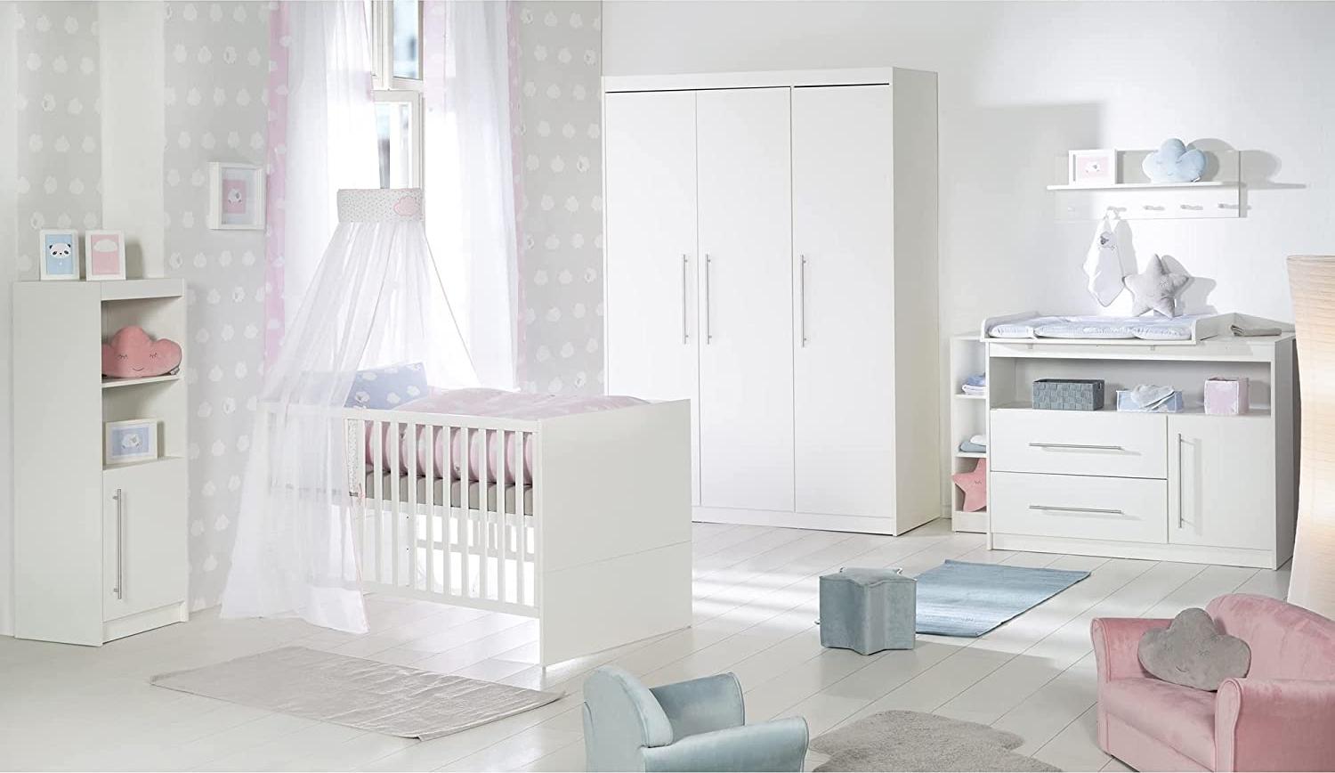 | Beschreibung | Das roba Kinderzimmerset 'Maren' in Weiß ist die ideale Einrichtung für das erste Babyzimmer. Das Set besteht aus einem Kombi-Kinderbett und einer breiten Wickelkommode. Das Kinderbett ist mit Umbauseiten (Art. Nr.: 10012WE) erweiterbar und bis zum 7. Lebensjahr oder 50 kg nutzbar. Die Wickelkommode mit angenehmer Wickelhöhe von 90 cm bietet viel Stauraum. Die Kindermöbelserie 'Maren' ist eph-zertifiziert und in Deutschland entwickelt. **Highlights** - Mitwachsendes Kinderbett bis zum 7. Lebensjahr - Breite Wickelkommode mit Wickelansatz - 3-fach höhenverstellbares Gitterbett - 3 herausnehmbare Schlupfsprossen - EPH-Zertifizierung für höchste Qualitätsansprüche **Produkteigenschaften** - Maße Bett: 80 x 76 x 142 cm (H x B x T) - Liegefläche: 70x140 cm - Maße Wickelkommode: 98,1 x 117,1 x 75 cm (H x B x T) **Lieferumfang** - 1x Kombi-Kinderbett - 1x breite Wickelkommode |