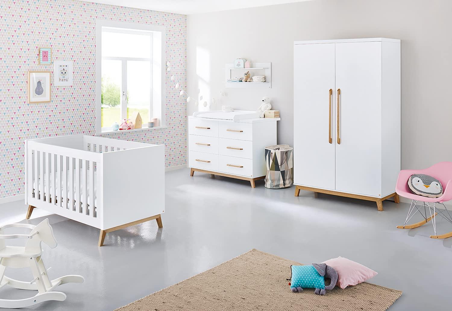- Das Pinolino 'Riva' 3-tlg. Babyzimmer-Set ist in der Farbe Weiß gehalten und besteht aus einem Kinderbett, einer Wickelkommode und einem Kleiderschrank.