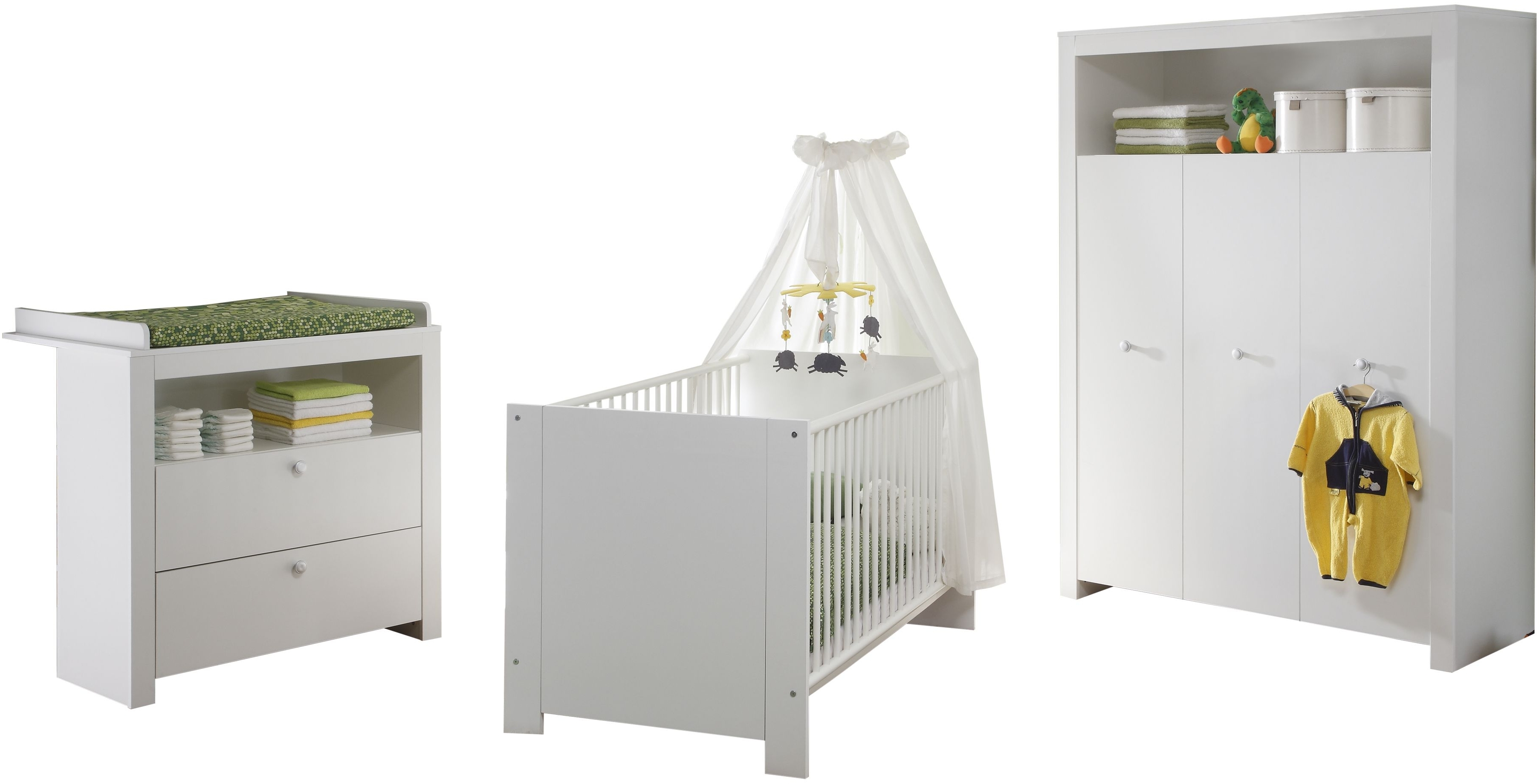 Babyzimmer-Set OLIVIA 3-teilig Modernes Babyzimmer-Set in der Farbe weiß mit weißen Griffen. Das Set besteht aus 1 Babybett, 1 Wickelkommode und 1 Kleiderschrank 3-türig.