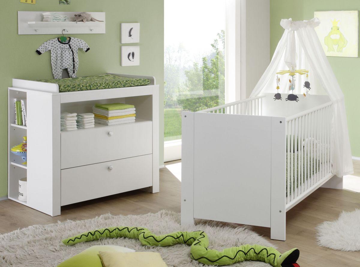 Details: Babyzimmer Olivia GE1196-06 Komplett Set 4-teilig Front und Korpus in weiß Dekor bestehend aus: Babybett B/H/T ca. : 143/83/78 cm Liegefläche 70x140 cm mit Matratzenrahmen (Lattenrost) 3-fach höhenverstellbar 3 Schlupfsprossen GS-Zertifizierung für geprüfte Sicherheit Optional dazu bestellen: 2 Bettseiten je B/HT ca. : 140/27/2 cm zum Umbau als Juniorbett mit Einstiegshilfe Optional dazu bestellen: Bettkasten B/H/T ca. : 139/16/70 cm Unterbett-Auszug auf Rollen Stauraum für Bettzeug Wickelkommode mit Wickelaufsatz B/H/T ca. : 96/104/69 cm 1 offenes Fach 2 Schubkästen Wickelfläche ca. 85x67 cm Wickelansatz abnehmbar GS-Zertifizierung für geprüfte Sicherheit Wandregal / Garderobenpaneel B/H/T ca. : 75/20/15 cm 1 breiter Regalboden Rückwandpaneel verdeckte Wandbefestigung 3 Garderobenknöpfe Regal für Wickelkommode B/H/T ca. : 25/93/32 cm links oder rechts hinter Wickelkommode stellbar 2 Regalböden, 3 offene Fächer Umbau Juniorbett, Bettkasten und Filz-Applikationen Rosa oder Blau: bitte wählen Sie oben aus Optional: 2 Bettseiten je B/HT ca. : 140/27/2 cm zum Umbau als Juniorbett mit Einstiegshilfe Optional: Bettkasten B/H/T ca. : 139/16/70 cm Unterbett-Auszug auf Rollen Stauraum für Bettzeug Qualität: Modernes Babyzimmer mit praktischen Details Front und Korpus in weiß Dekor, strapazierfähige Melaminbeschichtung Babybett mit 3 Schlupfsprossen Babybett umbaubar zum Juniorbett (optional) 3-fach höhenverstellbarer Matratzenrahmen Wickelkommode zur Kommode umbaubar Metallschienen kugelgelagert Griffe silberfarben Pflegeleicht durch glatte Oberflächen, einfach feucht abwischen min. 70% FSC®-zertifizierter Holzwerkstoff, aus kontrolliert nachhaltiger Forstwirtschaft GS-Zertifizierung für geprüfte Sicherheit Lieferumfang: Der Liefertermin wird telefonisch mit Ihnen abgesprochen Ihre Möbel werden Ihnen bis in das gewünschte Zimmer getragen Zerlegt/Selbstmontage, inkl. bebilderte Aufbauanleitung Montage- und Befestigungsmaterial Dekoration, Auflagen, Matratzen und Elektrogeräte sind nicht enthalten Der Betthimmel / Bettüberbau ist nicht enthalten und nicht lieferbar Produktbeschreibung für Babyzimmer komplett 'Olivia' 4-teilig, weiß Ein Traum in weiß. Das ist das 4-teilige Babyzimmer-Set , bestehend aus Babybett , Wickelkommode , Stand- und Wandregal. Gefertigt sind die einzelnen Möbelelemente aus besten Materialien, die zusätzlich mit einer strapazierfähigen Beschichtung ausgestattet wurden. Damit können Sie die Möbel bei Bedarf mit einem feuchten Tuch abwischen. Mit verschiedenen Details ausgestattet Das hochwertige Babybett lässt sich mehrfach in der Höhe verstellen und besitzt drei Schlupfsprossen , durch die der Nachwuchs bei Bedarf entweichen kann. Das Modell kann später optional zu einem Juniorbett umfunktioniert werden. Die Wickelkommode besitzt eine großzügige Auflage sowie viel Stauraum , damit Sie Wäsche und Windeln, Cremes und Lotionen sowie kleines Spielzeug Ihres Kindes verstauen können. Legen Sie die Wickelfläche zusätzlich mit einer weichen Auflage aus. Die beiden Regale für die Seite und die Wand bieten weitere Staumöglichkeiten. Das Wandregal ist zusätzlich mit drei Garderobenknöpfen versehen. Babyzimmer-Kombination jetzt bestellen Sichern Sie sich dieses hochwertige 4-teilige Möbelset für Babys erstes Zimmer undüberzeugen Sie sich von den ausgezeichneten Eigenschaften der Einrichtungsgegenstände. Zum Babymöbel-Set bieten wir einen passenden Kleiderschrank an. Bei Fragen kontaktieren Sie uns gern.