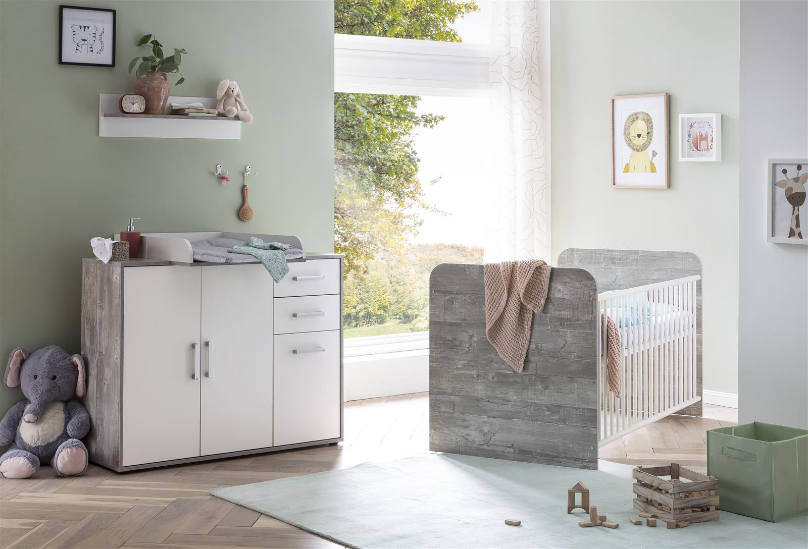 Mit diesem Baby-Zimmer Set, best. aus Baby Bett, Wickelkommode, Wickelaufsatz und Wandregal sind Sie umfassend ausgestattet. Die pflegeleichte und robuste Oberfläche ist beim Kopf- und Fußteil in Beton Dekor Melamin, das Schutzgitter in Buche massiv, weiß lackiert. Das Baby Bett ist die perfekte Wahl für den erholsamen Schlaf Ihres Kindes. Es hat eine Liegefläche von 70x140 cm und der 3-fach verstellbare Lattenrost (ca. 46, 33, 20 cm Abstand vom Boden bis Lattenrost) gehört mit zum Lieferumfang. Das Bett ist mit max. 20 kg belastbar und die max. Matratzenhöhe ist 10 cm. Für Sie als Eltern ist das in der oberen Position besonders rückenschonend. Diese Höhe ermöglicht es Ihnen, Ihr Baby einfach heraus zu heben. Mit dem Heranwachsen des Kindes können Sie dann eine tiefere Position des Lattenrostes wählen, so wie es für Sie von Vorteil ist. Das seitliche Gitter hat 3 Schlupfsprossen zum Herausnehmen, was Ihrem Kleinkind einen einfachen und sicheren Ein- und Ausstieg aus dem Bett ermöglicht. Das Kopf- und Fußteil ist oben an den Kanten gerundet. Die Bodenfreiheit ist ca. 18 cm. Die Stellfläche Babybett ist ca. 142 x H: 82 x T: 77 cm. Die Wickelkommode mit 3 Türen, 2 geräumigen Schubladen und dem Wickelaufsatz gehört ebenfalls zum Lieferumfang des Set´s. Mit diesem Set haben Sie hier alles sofort zur Hand, was Sie im Kinderzimmer benötigen. Hinter den beiden Türen links befinden sich 2 geräumige Fächer, der Boden ist nicht verstellbar. Die Fachinnenmaße links sind ca. : B: 69 x H: 39 x T: 33,5 cm. Das große Fach hinter der unteren Tür rechts, hat die Innenmaße ca. : B: 34 x H: 48 x T: 33,5 cm. Die beiden darüber befindlichen Schubladen haben das Innenmaß von ca. : B: 30 x H: 8,5 x T: 30,5 cm. Auch die vollwertige Gesamttiefe der Kommode von 37 cm bietet Stauraum Vorteile. Die pflegeleichte und robuste Oberfläche ist in der Ausführung Korpus Beton/Front Weiß Melamin Dekor. Das Trägermaterial ist Holzwerkstoff, mit einer hochwertigen Kante beim Korpus. Diese Kommode kann später, sollte der Wickelaufsatz nicht mehr benötigt werden, auch einzeln gestellt werden. Sie hat eine stabile Rückwand, innen in Dekor weiß. Der prägnante Griff aus Kunststoff in Alu Optik auf der Front, setzt einen modernen Akzent. Der Wickelaufsatz wird einfach auf die Kommode aufgesetzt und findet durch die vordere und hintere Basisplatte halt. Zusätzlich wird der Aufsatz noch mit der Kommode verschraubt, damit er sich nicht heben kann. Die Wickelfläche ist ca. : B: 52 x T: 67 cm, die Umrandung hat eine Höhe von ca. 9,5 cm. Die Wickelauflage gehört nicht zum Lieferumfang, nur der Aufsatz. Die Außenabmessung des Wickelaufsatz ist ca. : B: 52 x H: 10,8 x T: 68,5 cm. Es werden Metall-Scharniere eingesetzt. Benötigte Stellfläche der Kommode ca. : B: 108 x H: 85 x T: 37 cm. Letztlich gehört auch das Wandregal zum Set. Es kann über die Kommode montiert werden und man hat die Dinge schnell griffbereit, ohne dass das Kind darauf Zugriff hat. Die pflegeleichte und robuste Oberfläche ist in der Ausführung Rückwand Paneel Beton Dekor und der Ablageboden in Weiß Melamin Dekor. Die Ablagefläche ist ca. : B: 67 x T: 14 cm, bei einer max. Belastung des Regals sind ca. 3 kg. Die Dekoration gehört nicht zum Lieferumfang. Der Artikel ist zerlegt, mit Aufbauanleitung, zur einfachen Selbstmontage. Außenabmessung Wandregal ca. : B: 70 x H: 19x T: 17,2 cm. Made in Germany. Produktdetails • Farbe: Beton/Weiß Melamin Dekor • Material: PEFC-Zertifiziert, Spanplatte/Dekoroberfläche • Versandzustand: zerlegt • Artikelgewicht: 62,3 kg