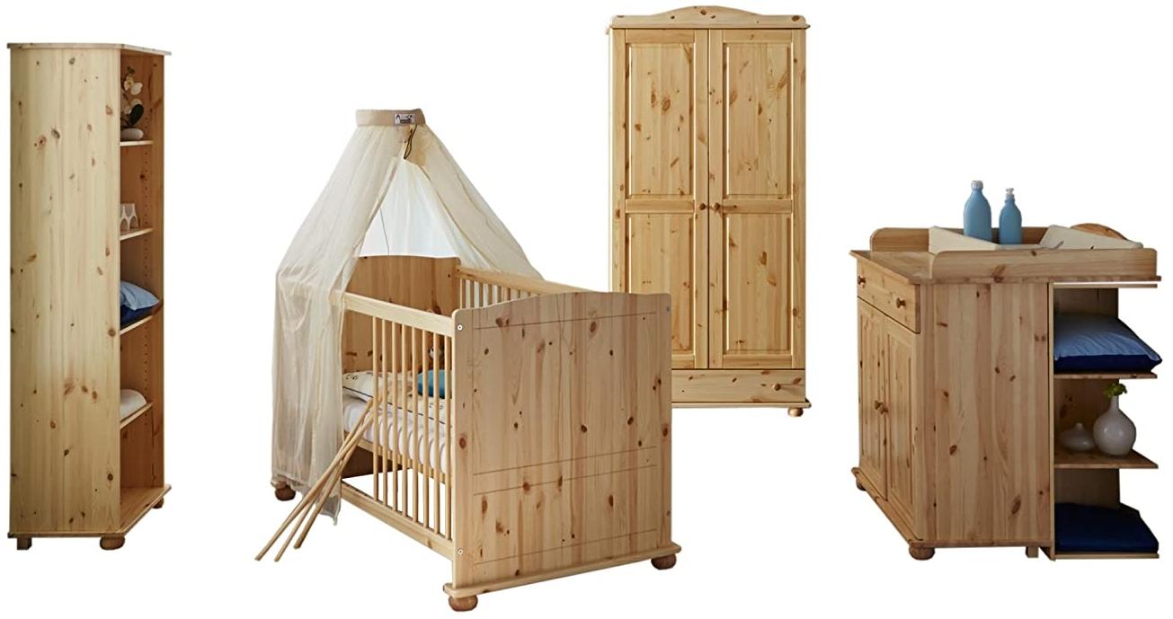 Das Ticaa 'Gina' 4-tlg. Babyzimmer-Set aus massiver Kiefer bietet eine umfassende Ausstattung für Ihr Kind. Es beinhaltet ein Babybett mit 3 Schlupfsprossen, eine Wickelkommode mit Fallschutz, ein Anstellregal, einen Kleiderschrank und ein Standregal. Stabilität, Funktionalität und Sicherheit stehen im Vordergrund, während die ansprechende Optik das Zimmer harmonisch ergänzt. **Highlights** - Babybett mit 3 Schlupfsprossen für einfache Nutzung - Wickelkommode mit Fallschutz für zusätzliche Sicherheit - Anstellregal mit 3 Fächern für praktischen Stauraum - Kleiderschrank mit 2 Türen und viel Stauraum - Standregal mit 5 großen Fächern für optimale Organisation **Produkteigenschaften** - Liegefläche: 70 x 140 cm - Außenmaß Babybett: 76,5 x 144 cm - Abmessungen Bett: Tiefe: 144 cm, Breite: 76,5 cm, Höhe: 89 cm - Abmessungen Kommode: Tiefe: 45 cm (inkl. Wickelaufsatz 80 cm), Breite: 96 cm, Höhe: 104 cm - Abmessungen Anstellregal: Breite: 35 cm, Höhe: 88,5 cm, Tiefe: 35 cm - Abmessungen Kleiderschrank: Tiefe: 56 cm, Breite: 96 cm, Höhe: 195 cm - Abmessungen Standregal: Tiefe: 38 cm, Breite: 60 cm, Höhe: 170 cm - Material: Kiefer-Massivholz **Lieferumfang** - Babybett, inkl. Lattenrost - Wickelkommode - Anstellregal - Kleiderschrank - Standregal - Ohne Dekoration - Matratze separat erhältlich