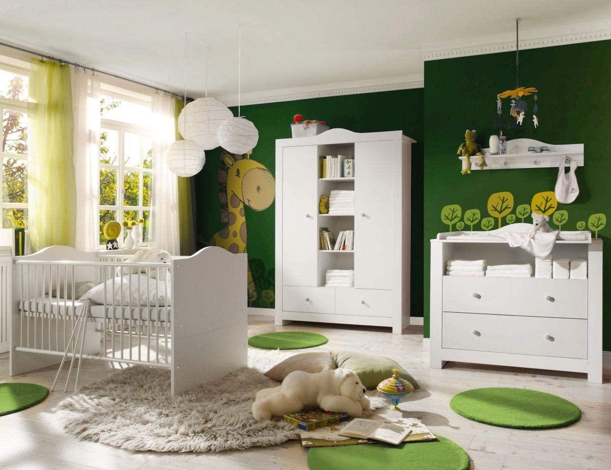 | Lieferumfang | Die Lieferung umfasst ein Babybett inkl. Lattenrost, Wickelkommode, Kleiderschrank und Hängeregal. |